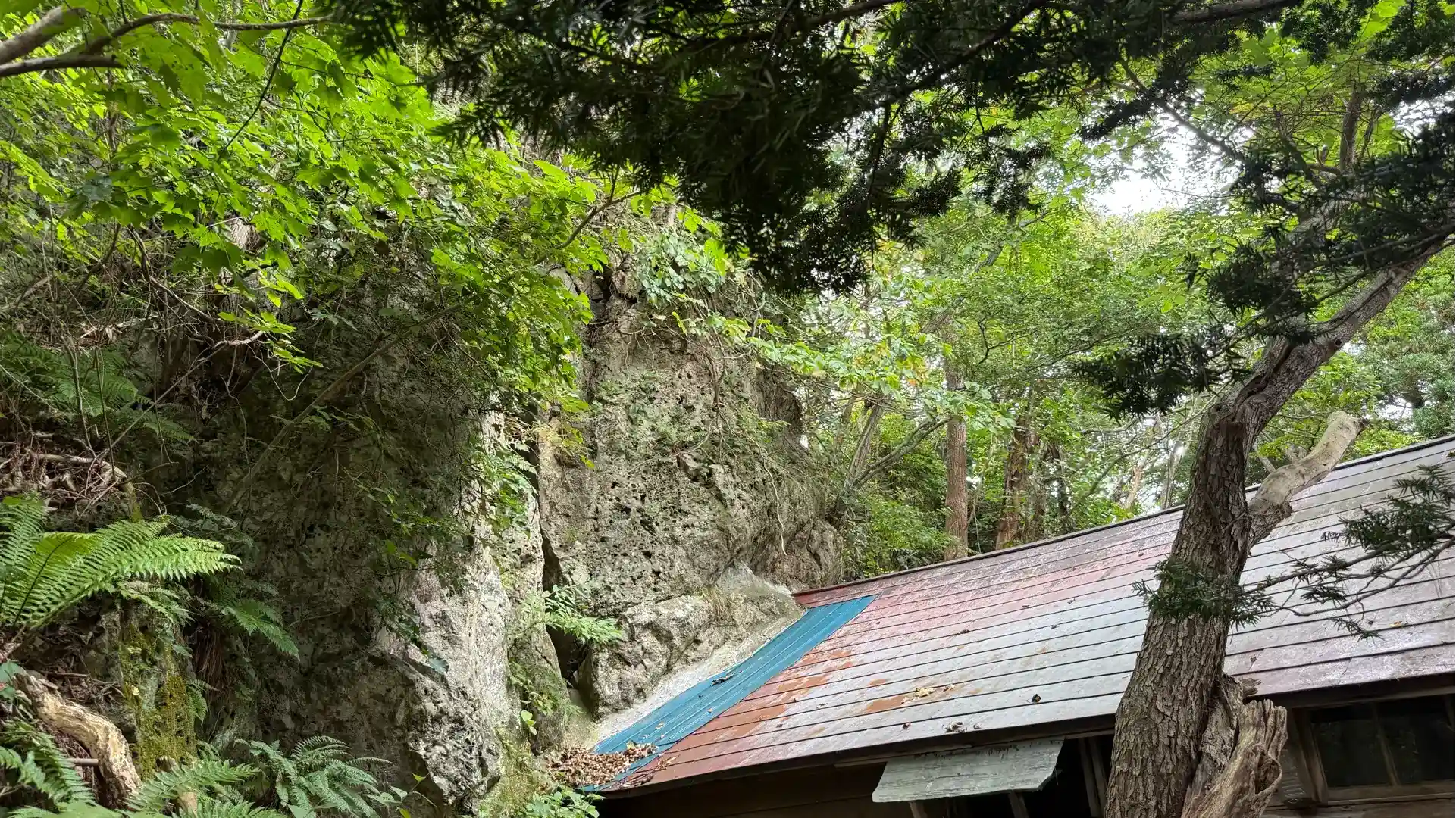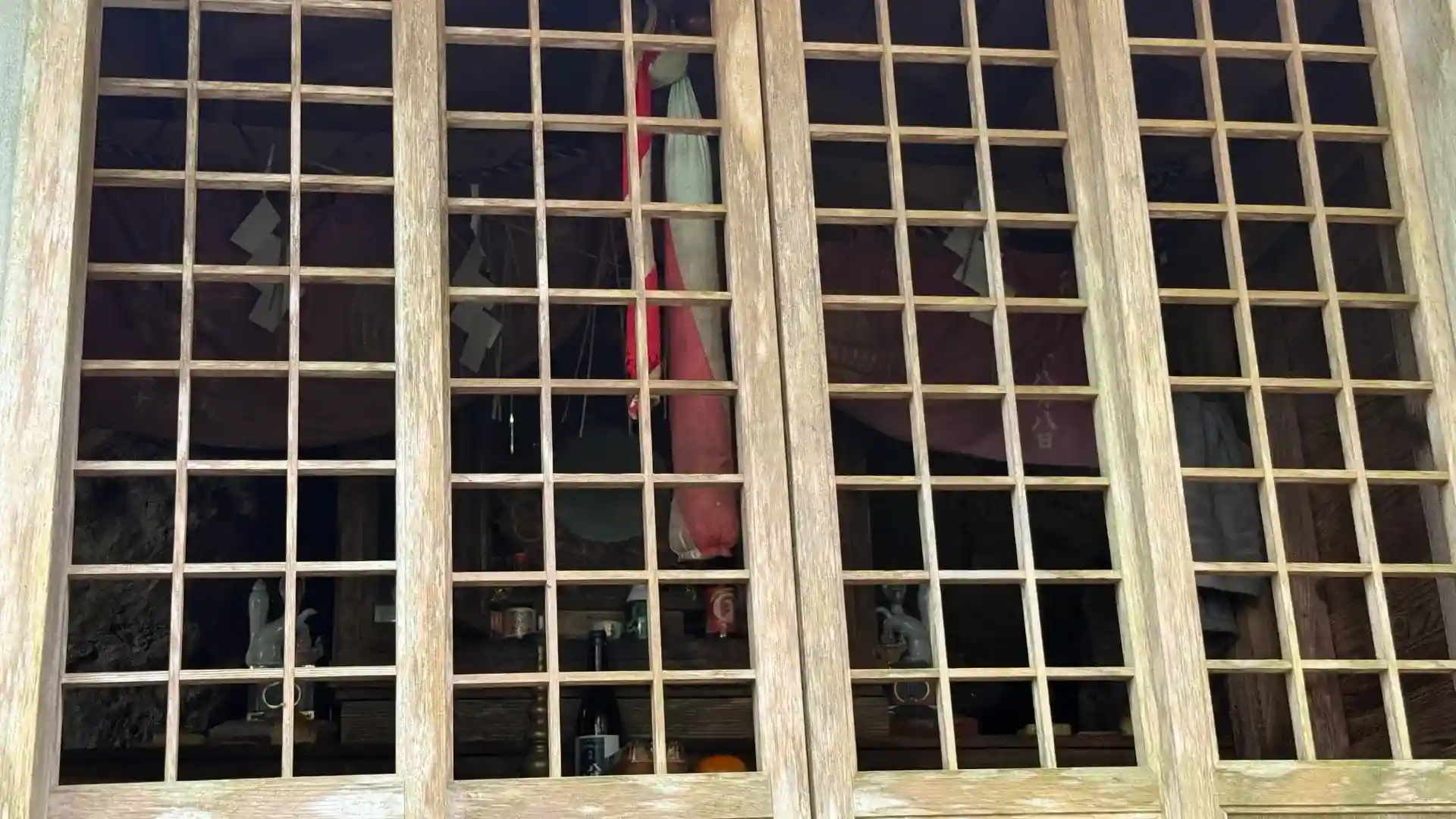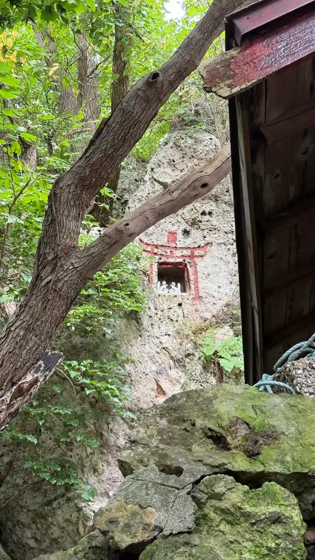 巨大岩をくり抜いているため、奥はそのまま岩壁で、それに寄り添うようにお社が建てられています。