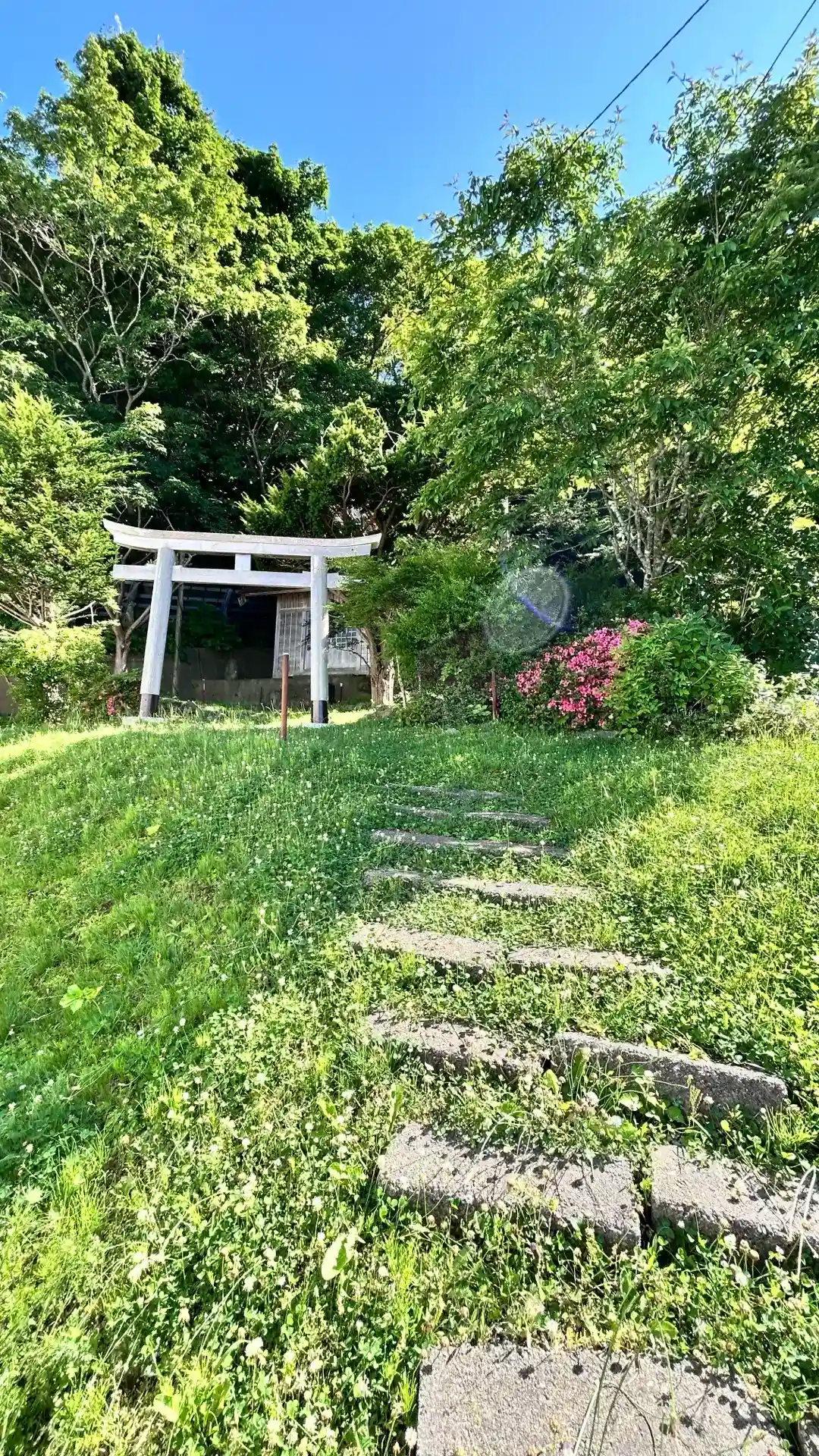 民家の敷地を通らないといけないので、遥拝にしようかなと思いましたが、鳥居前まで行けるように小さい階段と道があったので少しだけお邪魔しました。
