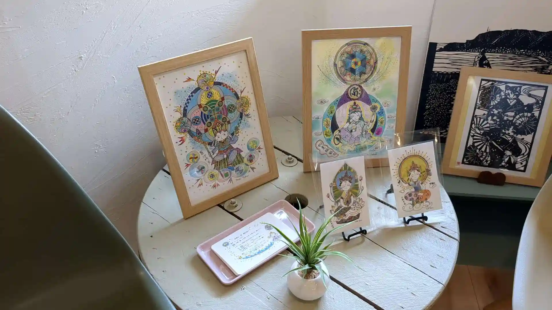 自由にくつろげるフリースペースには切り絵やイラストなどが飾られ様々な授与品なども置かれています。お寺に「聖☆おにいさん」が置かれているのがちょっと面白い。アットホームな雰囲気のお寺です。