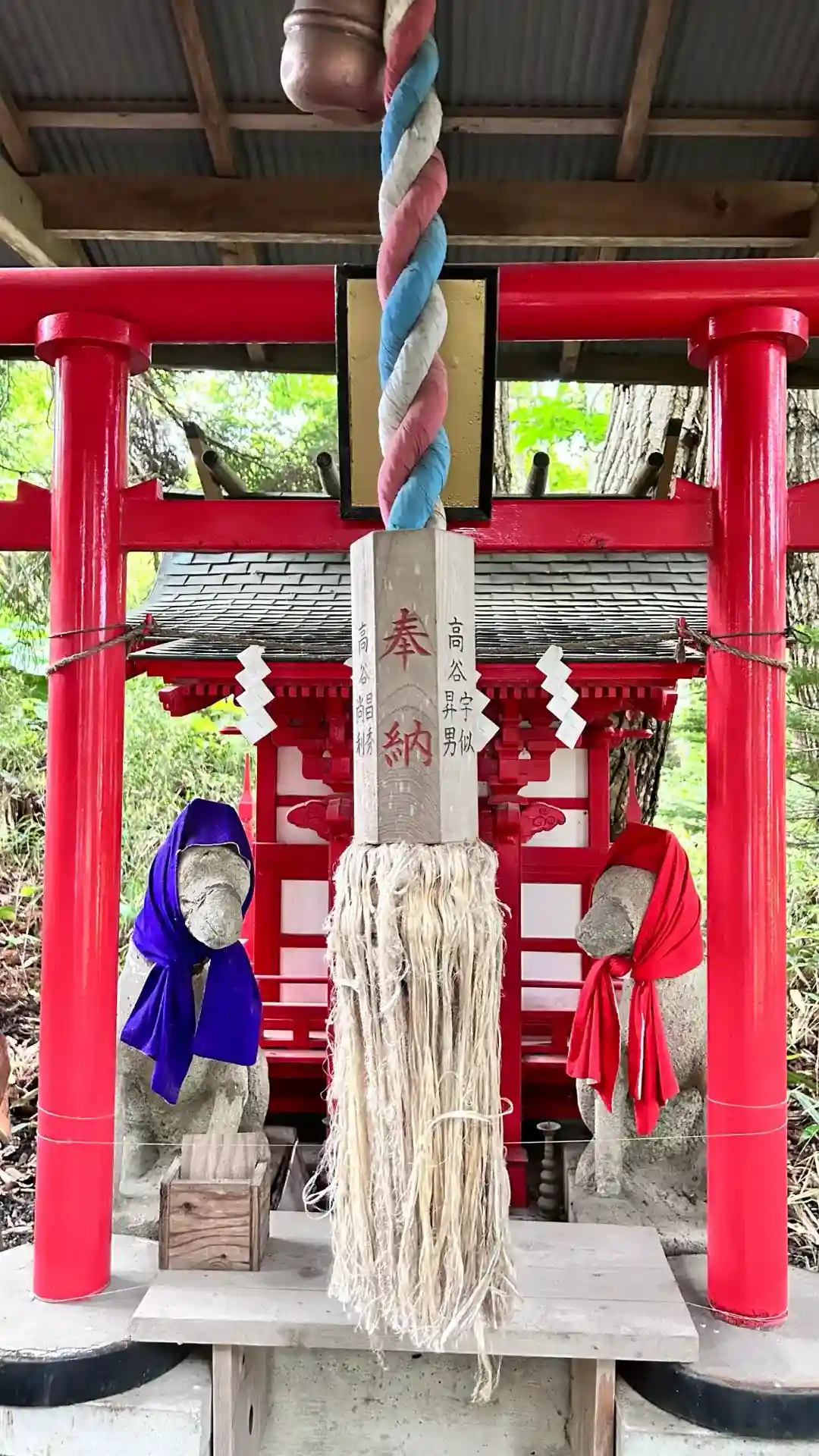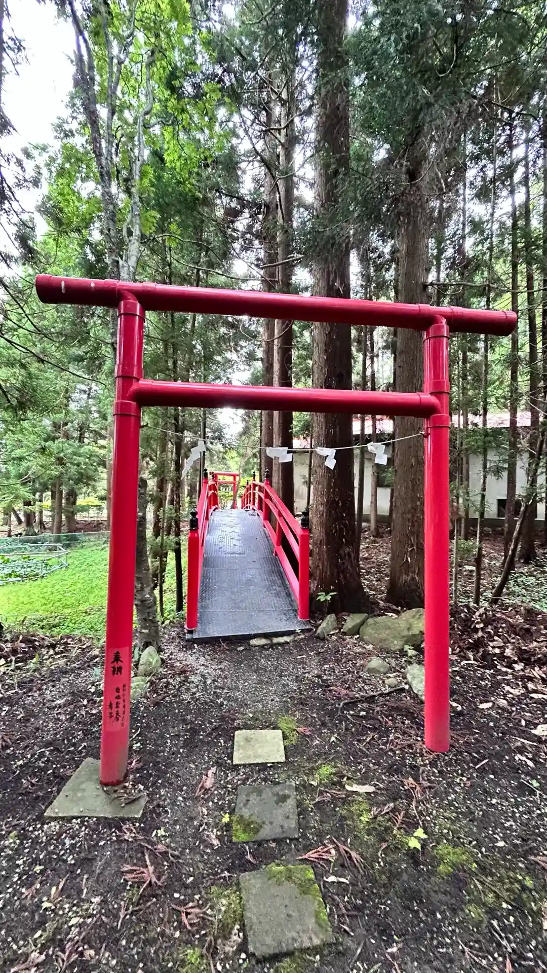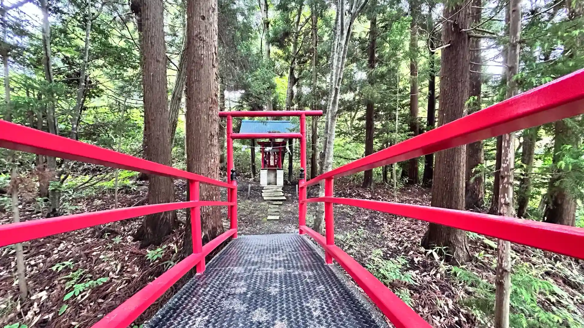 綺麗な赤色の細い橋の参道を歩いていくと、木に囲まれてひっそりと鎮座されていました。
