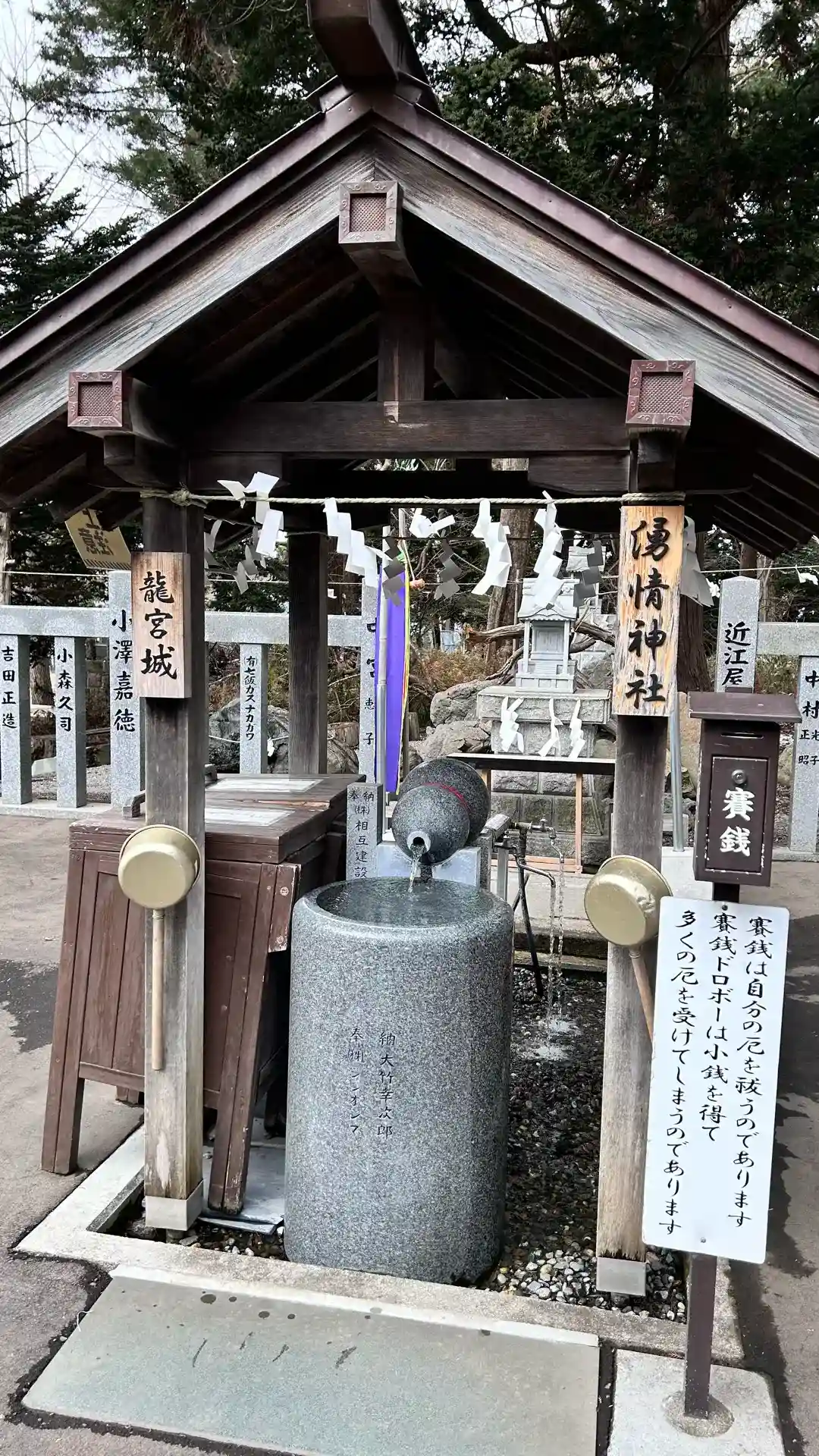 三嶋神社(龍宮城)湧情神社と龍宮城の手水舎の様子です(水占い、水汲み)