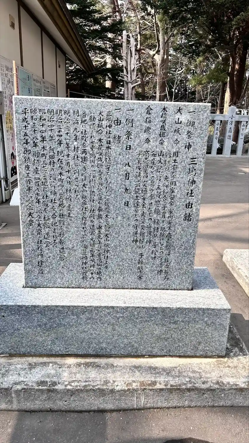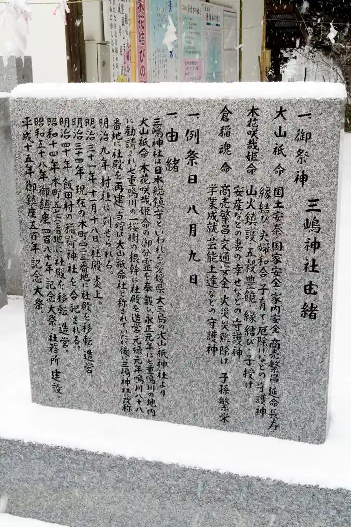 三嶋神社 境内にある(御祭神と由緒)が書かれてる(三嶋神社由緒碑)の様子です