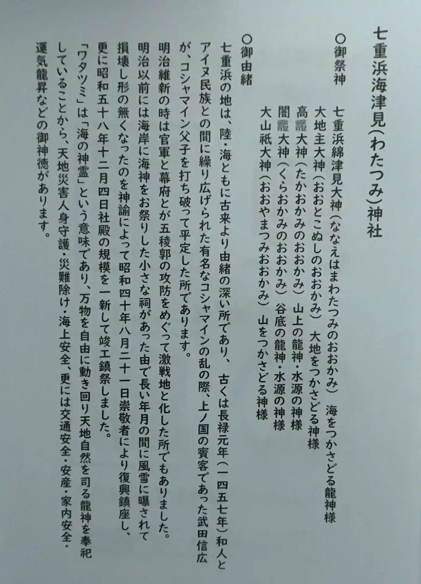 七重浜海津見神社 御朱印と一緒に頂いた授与品(御祭神、由緒)が書かれてます