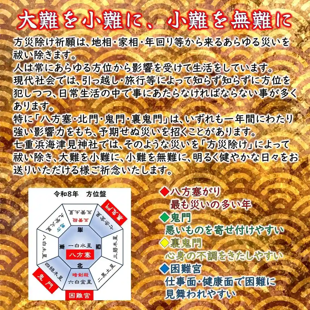 方災の中で最も災いの多い年とされる八方塞がり、悪いものを寄せ付けやすいとされる鬼門、心身の不調をきたしやすいとされる裏鬼門、仕事面・健康面で困難に見舞われるとされる困難宮の方位に入った場合は、方災よけのお祓いをお受けになられることをお勧めいたします。