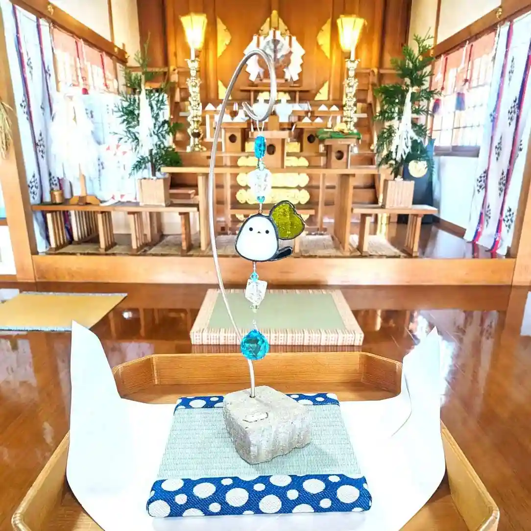 サンキャッチャーはミニ畳の上に設え、共にお供えさせていただきました⛩