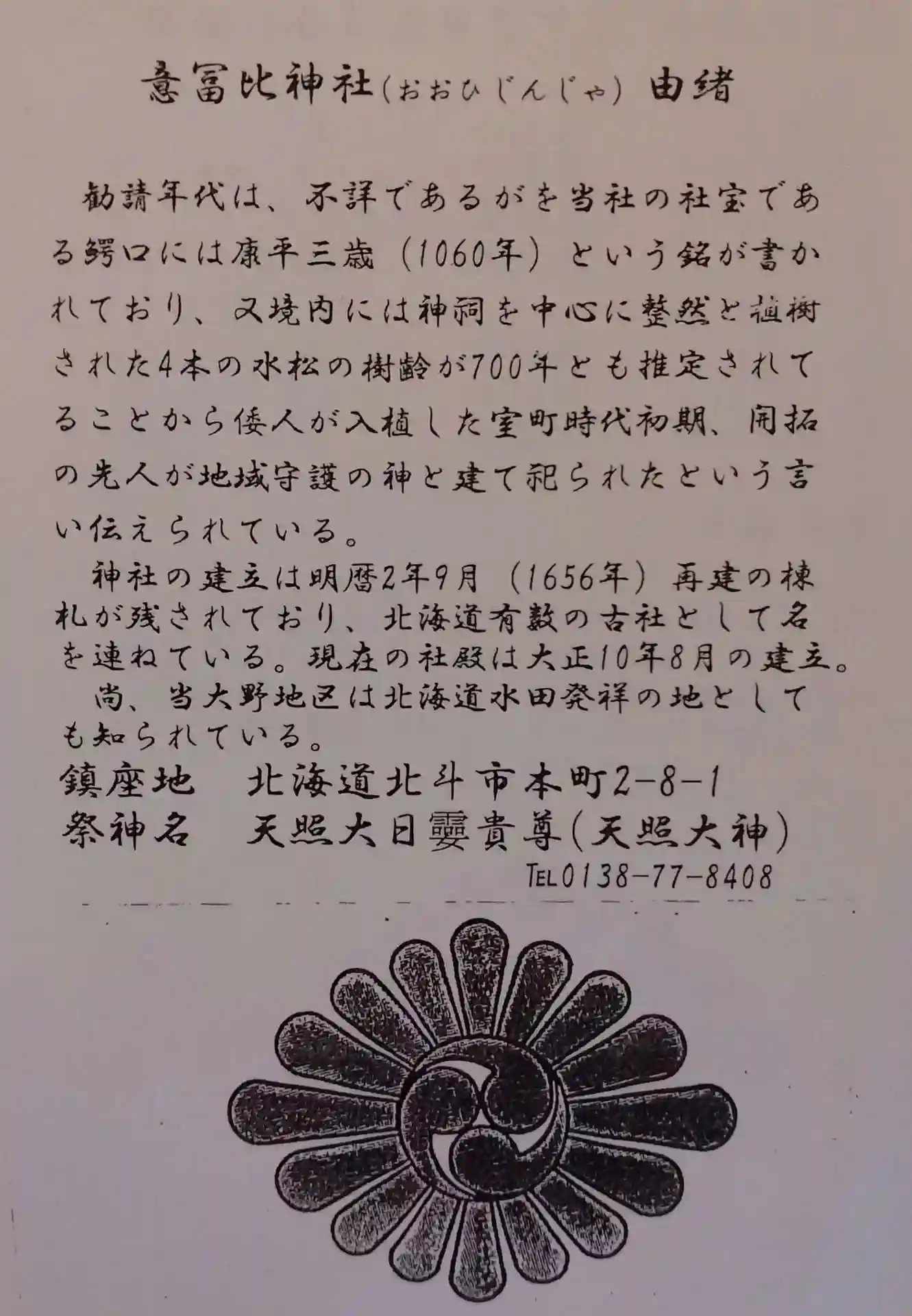 意富比神社 御朱印頂いた授与品(由緒、鎮座地、祭神名)が書かれてます