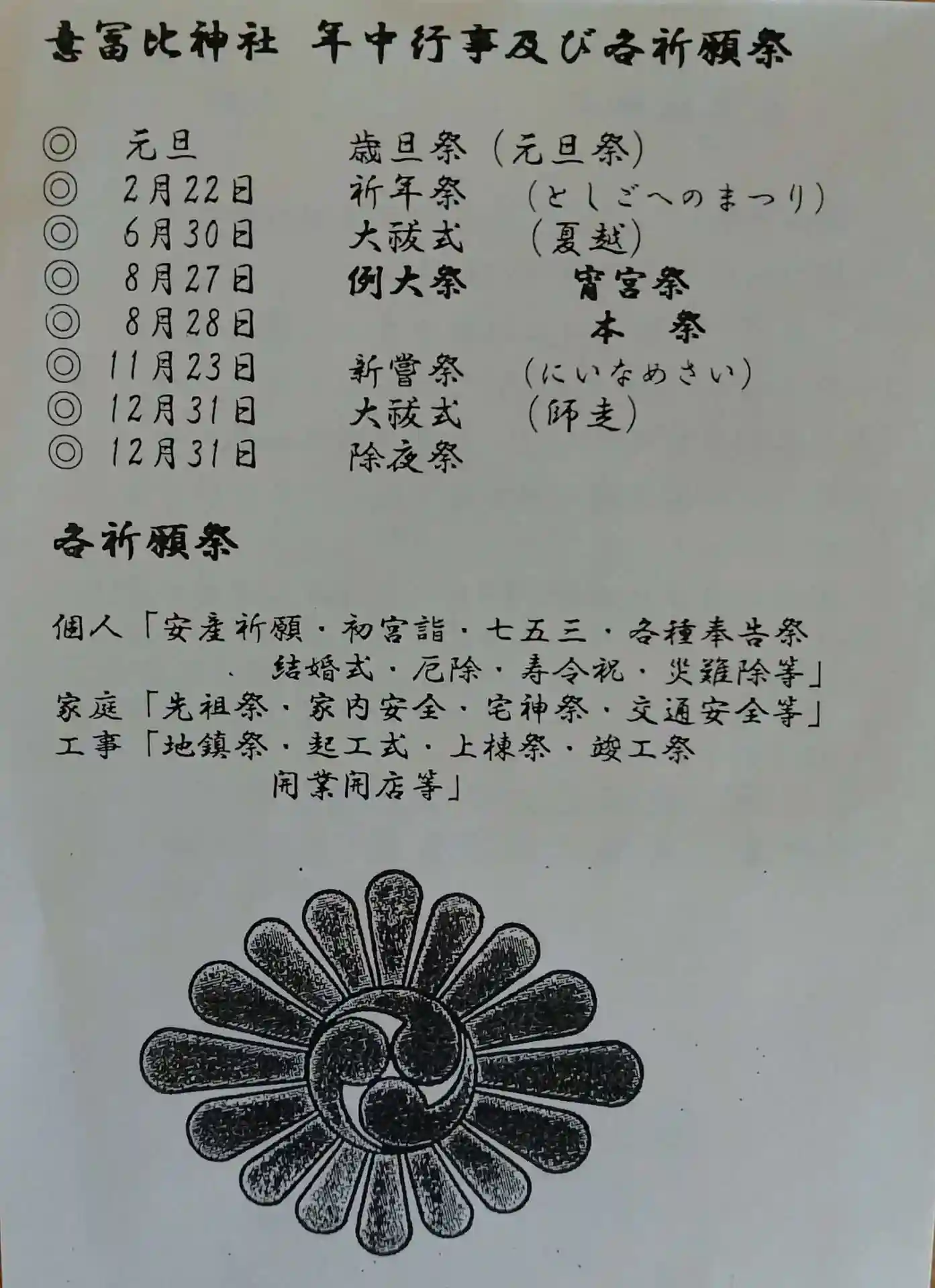 意富比神社 御朱印と一緒に頂いた授与品(意富比神社:年中行事及び各祈願祭)が書かれてます