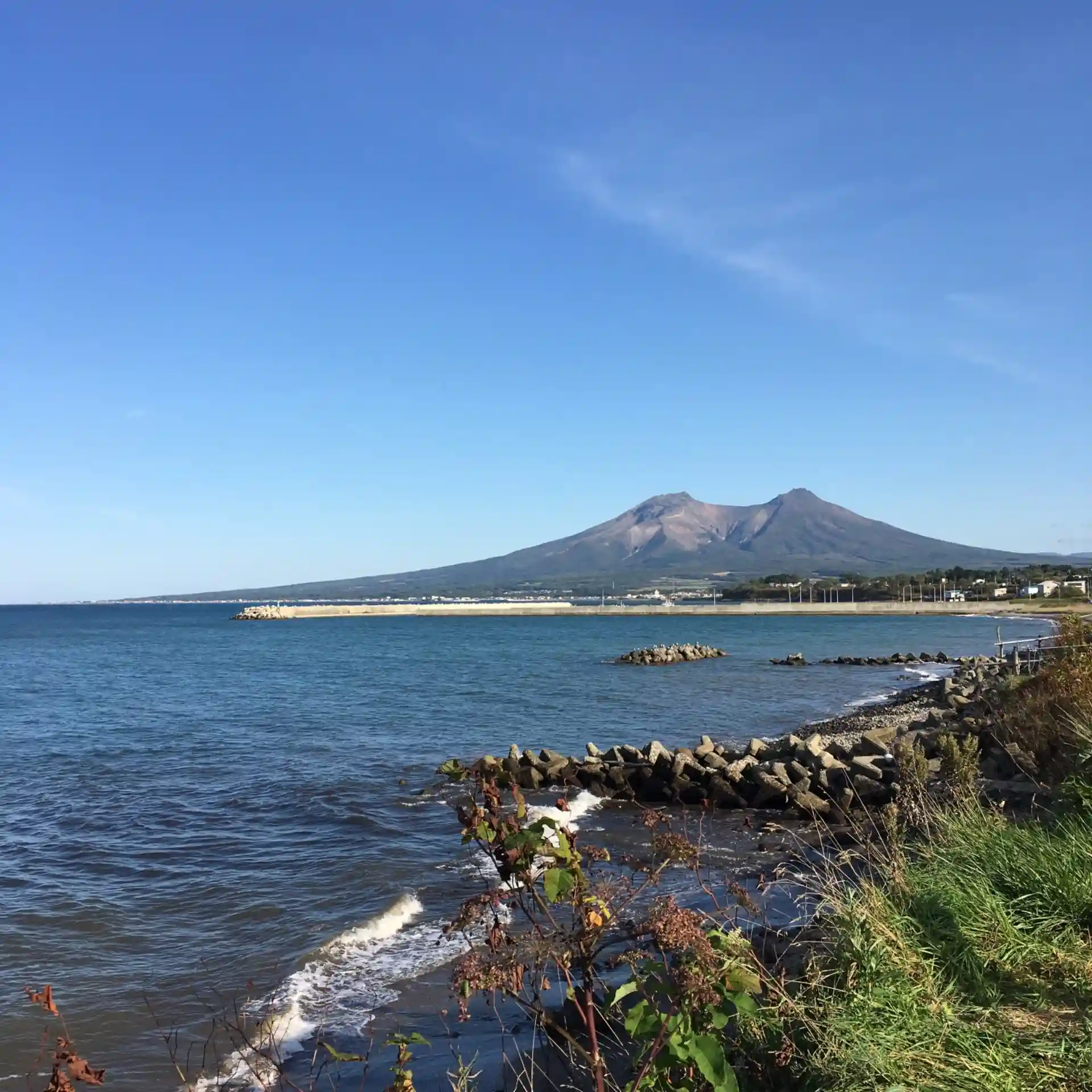 「富士見町」という地名が気になり、この富士はもしや蝦夷富士?と思って、森町市街を抜けても国道に戻らずに海岸線を行ってみたら、ビンゴでした。他の山に隠れることなく羊蹄山の稜線が際立ち、お天気も良かったので眼福。そのまま海沿い道路を走ったら、どん詰まりに榎本武揚上陸の地があり、そこから見る駒ヶ岳が今までの中でベストでした。