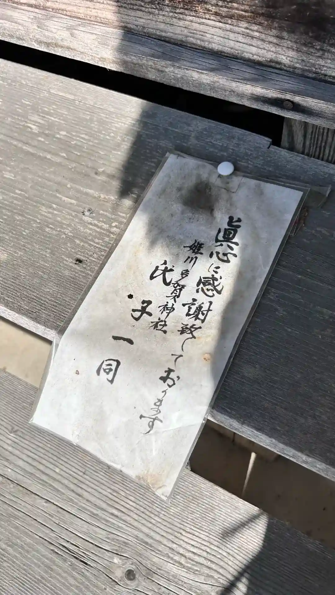 お賽銭箱の代わりに缶の貯金箱があり、持ち上げると地域の氏子さんのメモが。
