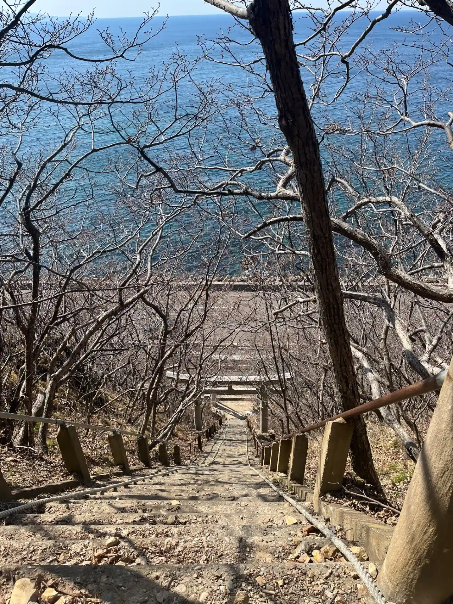 修験場感が半端ない急階段。ロープが垂れています。階段の先は山道が本殿まで続くそうです。