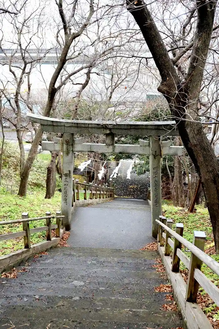 鳥居の鈴~昨年の参拝時には下に御賽銭箱が置いてあり、階段を上がれない方が遥拝できるようになっていました。鈴だけだとちょっと不思議な鳥居(笑)