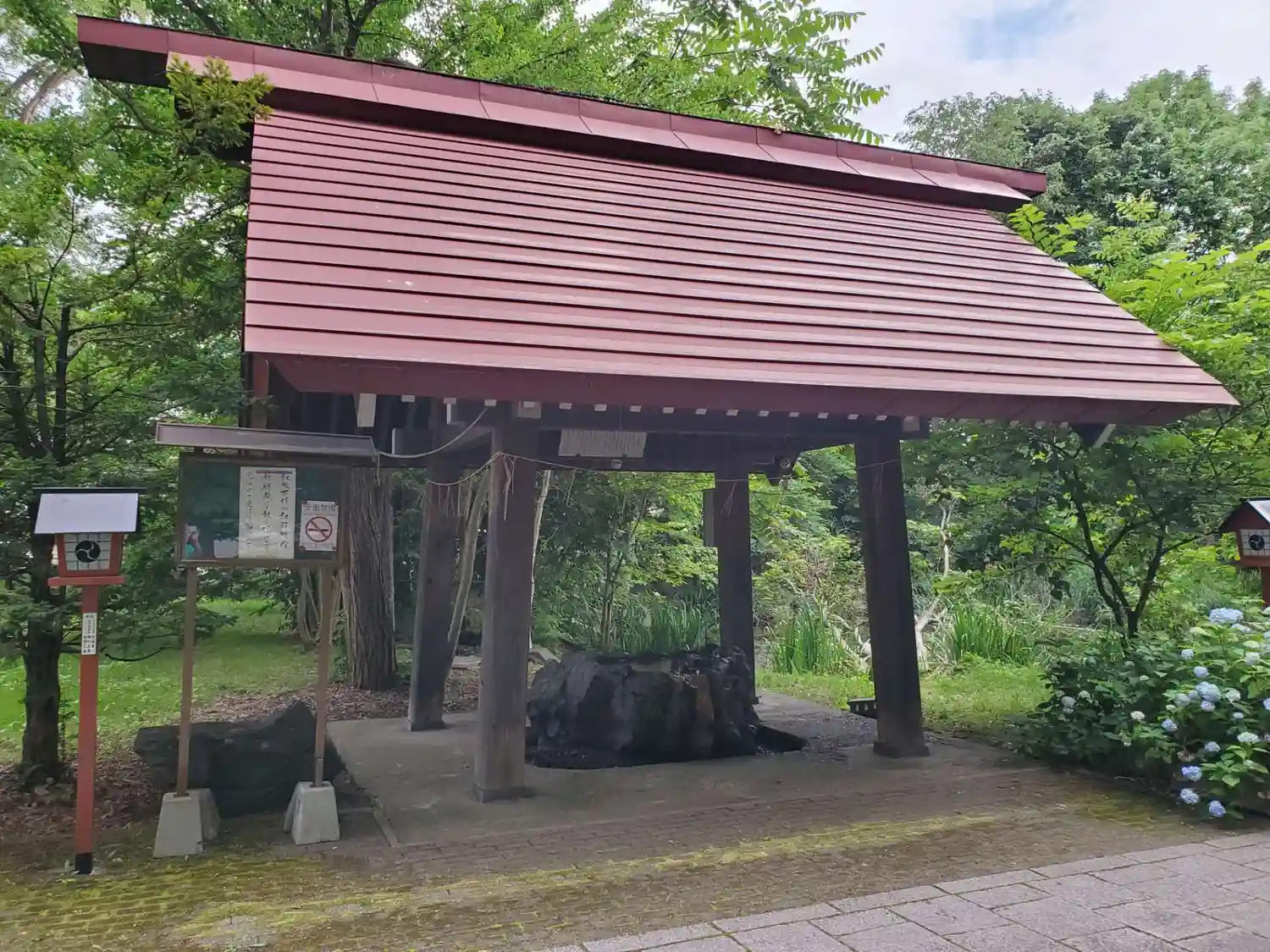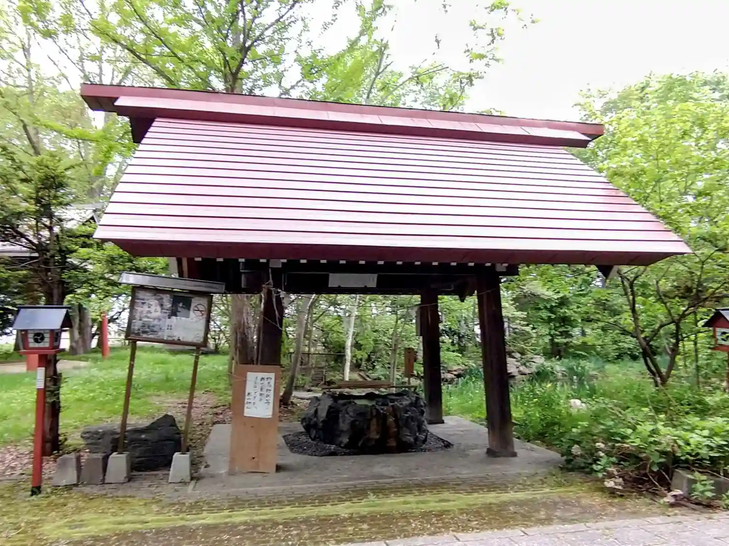 「手水舎」と「古潭石」 手水鉢はアイヌ伝説の秘境神居古潭の石
