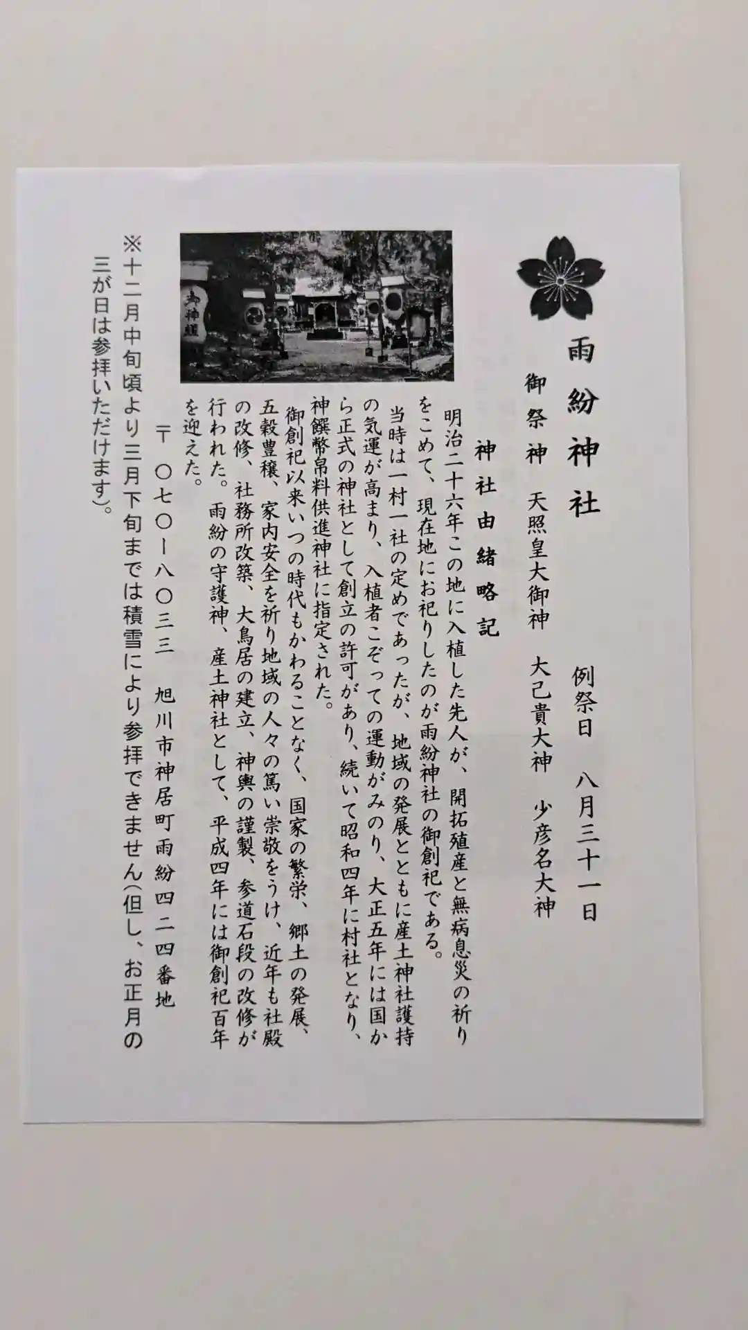 明治二十六年この地に入植した先人が、開拓殖産と無病息災の祈りをこめて、現在地にお祀りしたのが雨紛神社の御創祀である。