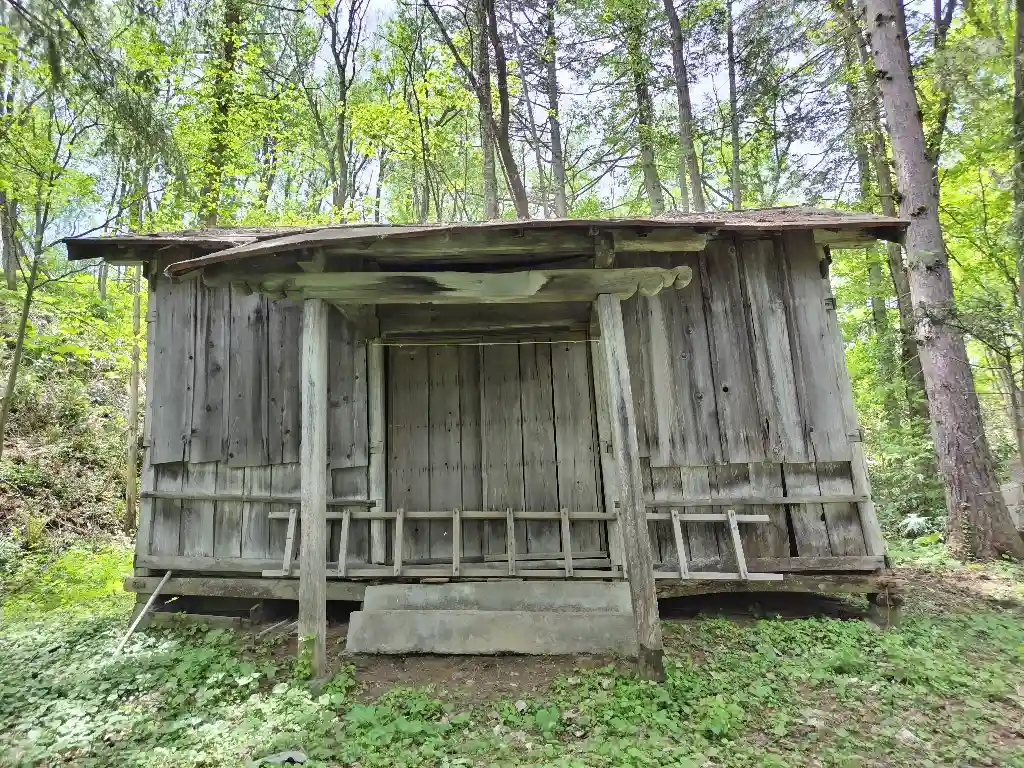 拝殿は思っていたよりはしっかりとしていましたが、戸の前には梯子が横に置かれており侵入を拒んでいるかのようです。