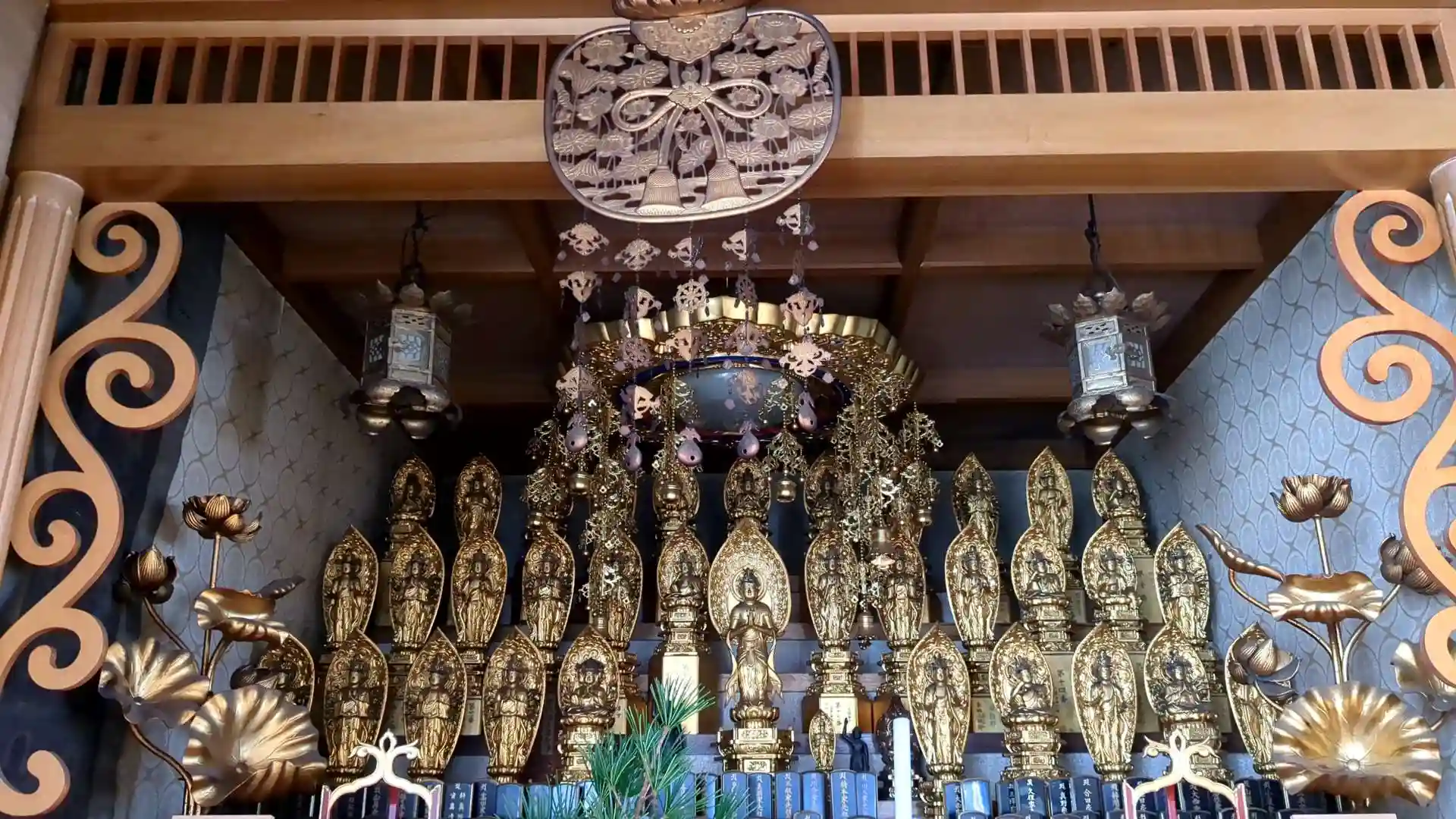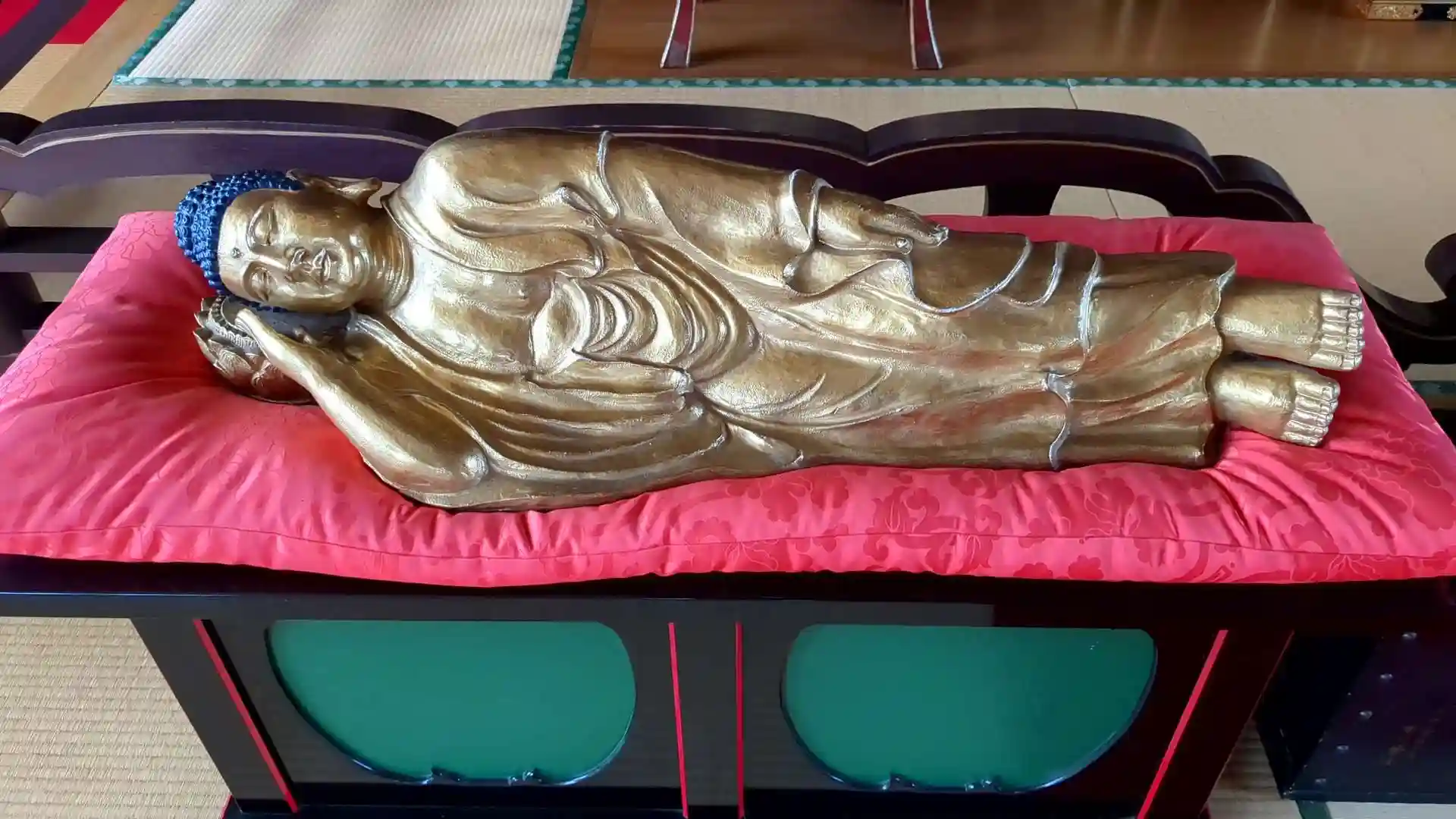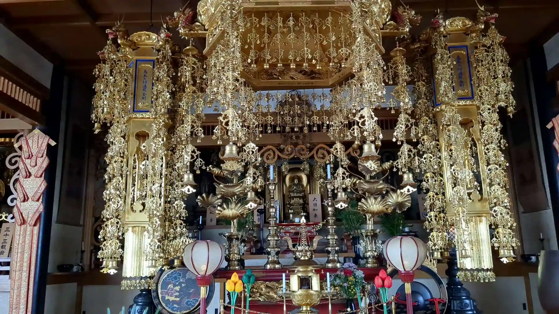 本堂は建物2階。御本尊様の他にもお不動様や涅槃像などの様々な仏像が祀られていました。