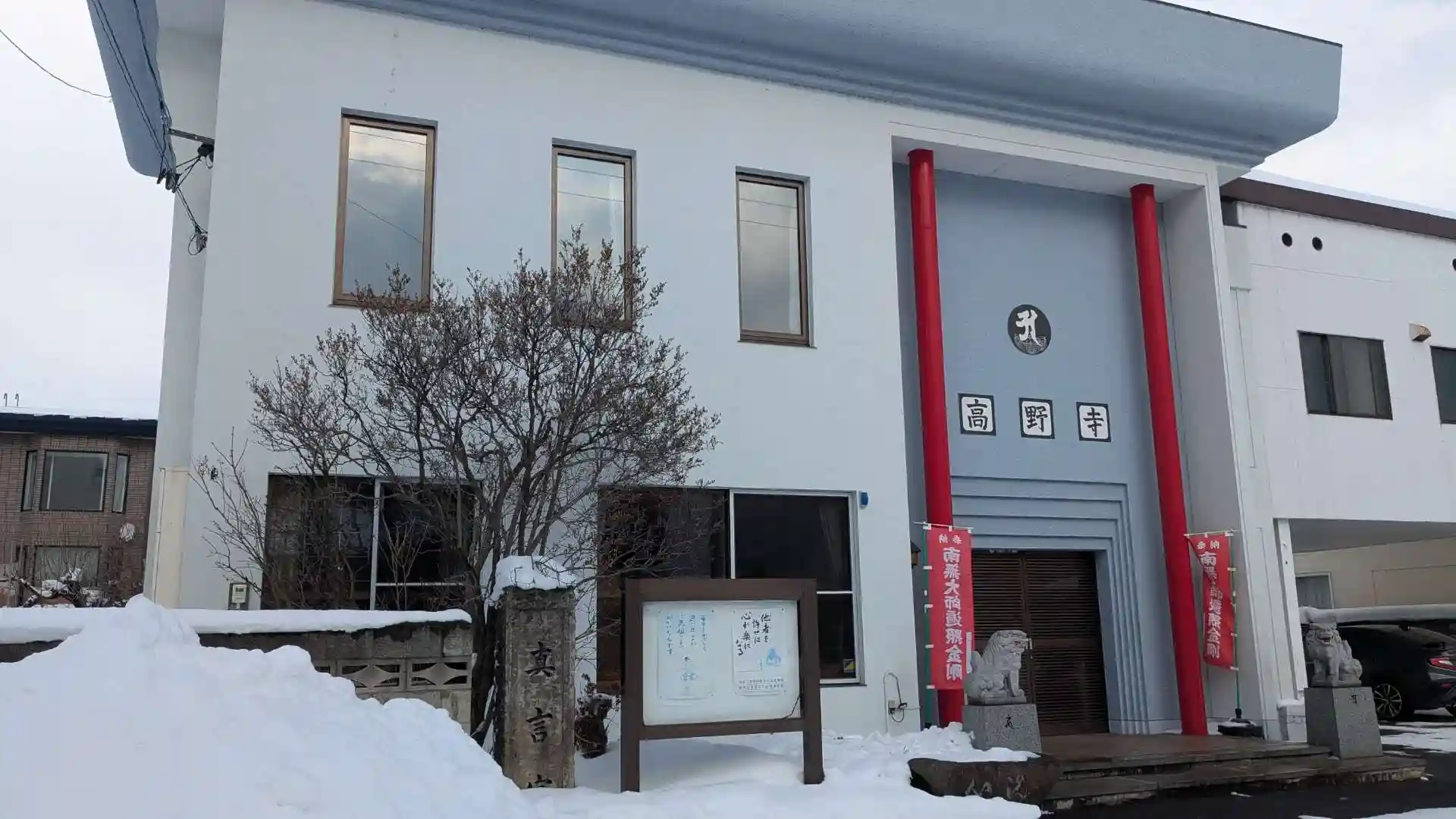 建物の外観は近代的でお寺とは思えないですね。狛犬がいるのもお寺としては珍しい気がします。狛犬さん寒そうですね🥶
