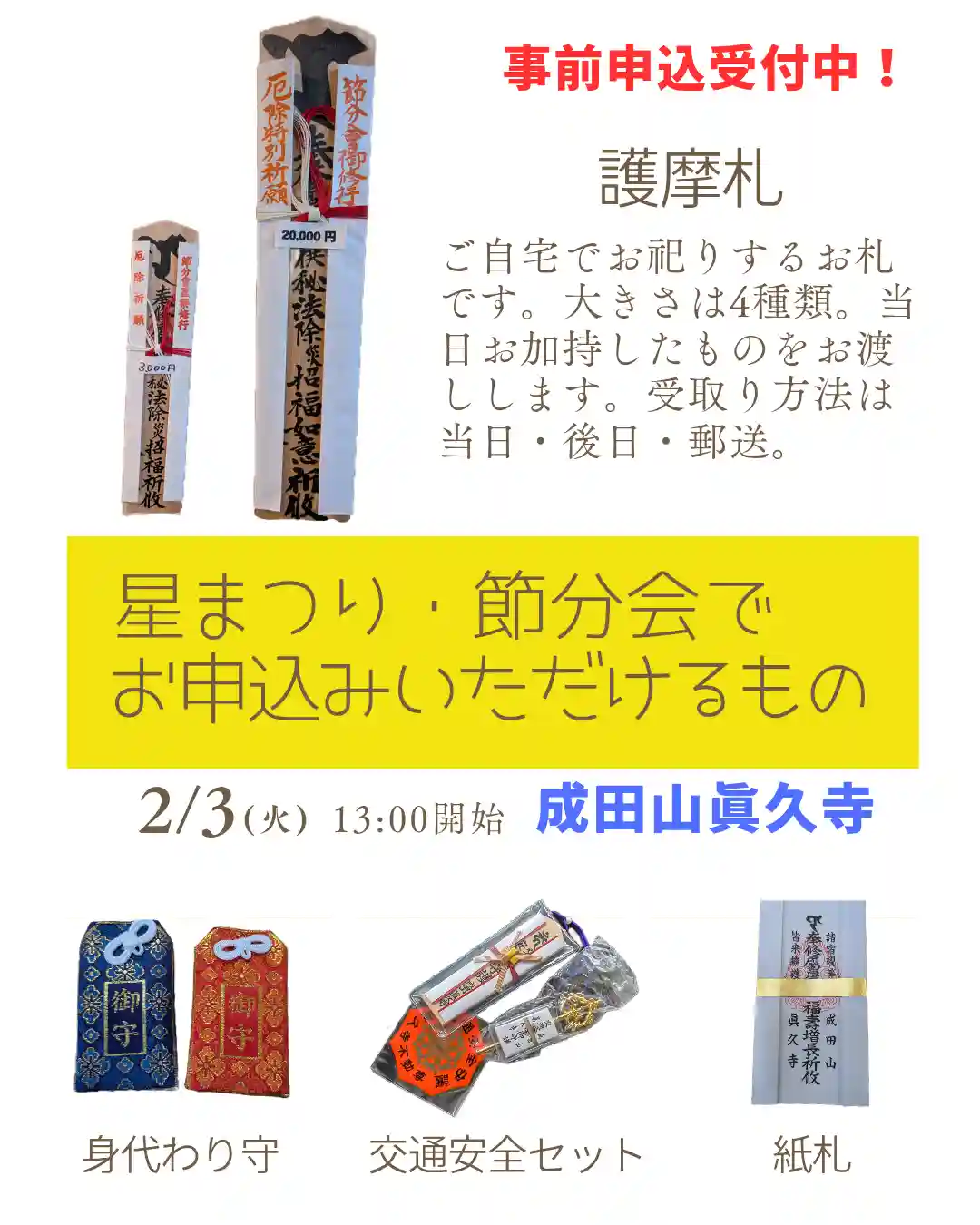 | 郵送対応 | 「成田山眞久寺オンライン授与所」にて護摩札・御朱印・御守・お清め塩などを郵送で頒布しています。 | ||