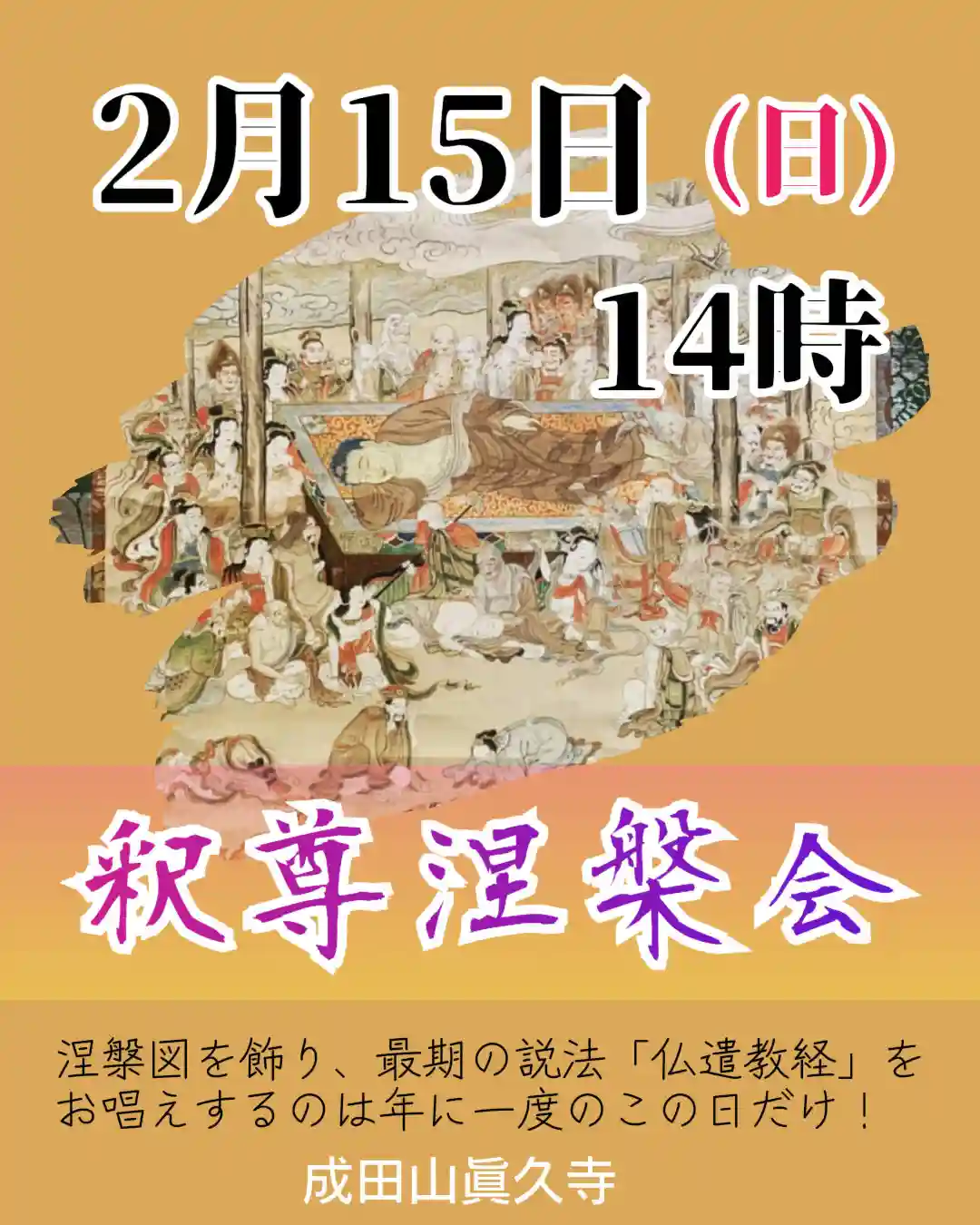 On February 15th, we start "Shakuson-nehan-e" at 2:00pm at main hall.