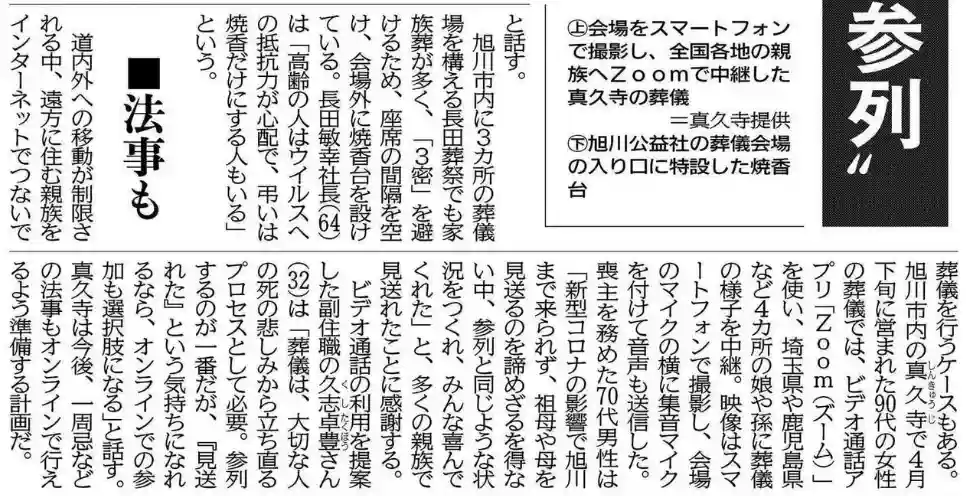 6月6日(土)発行の北海道新聞朝刊に、4月23~24日に眞久寺にて行った通夜・葬儀のオンライン中継の内容が掲載されました。