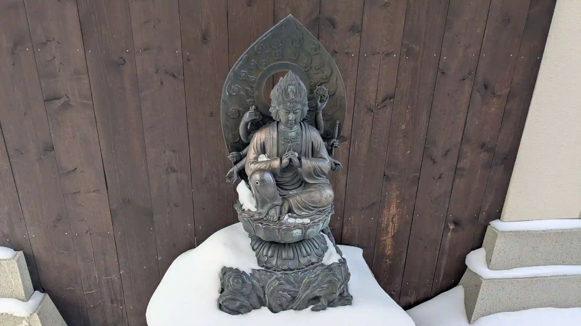 境内はもちろん雪に覆われています。午年なので境内の馬頭観音様にも手を合わせてきました。近くでよくよく見るととても立派な仏像ですね。