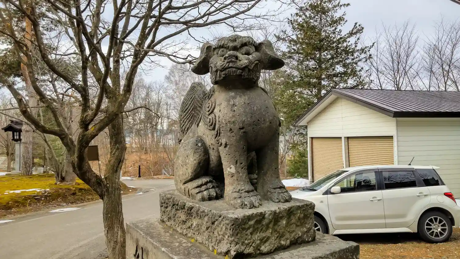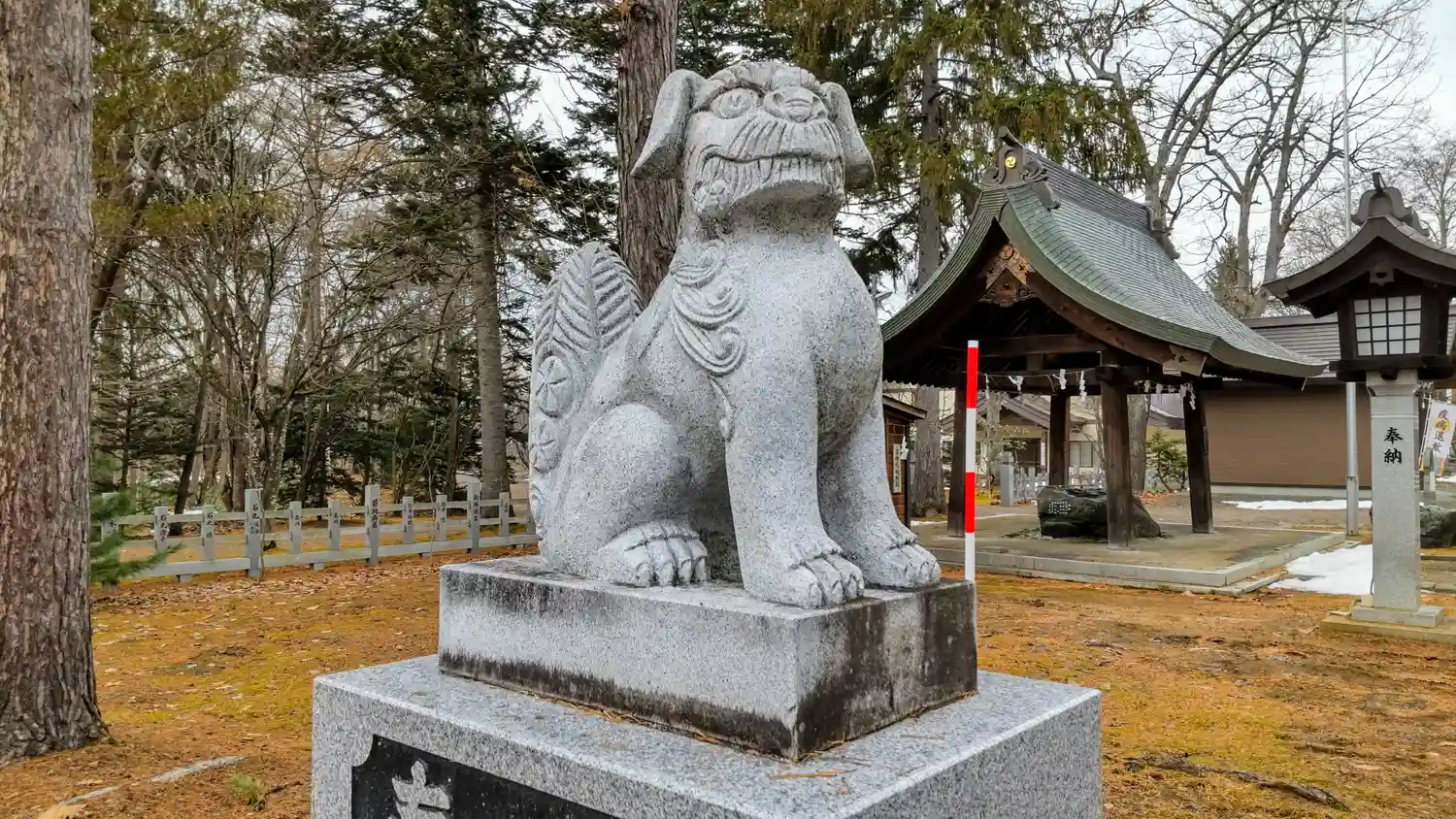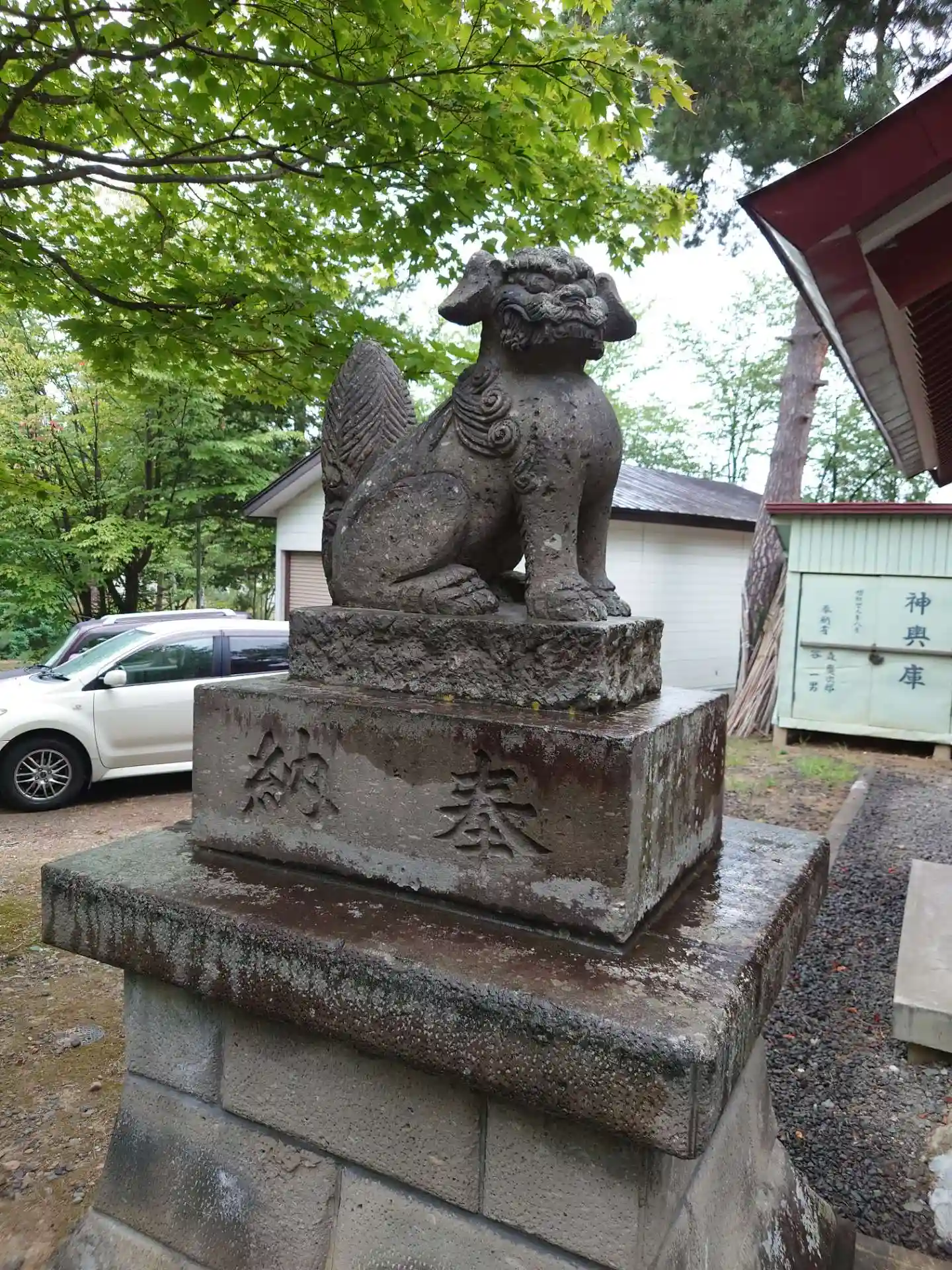 参道左側の<狛犬>。尻尾の太さは北海道風だが、見た目はとても個性的。
