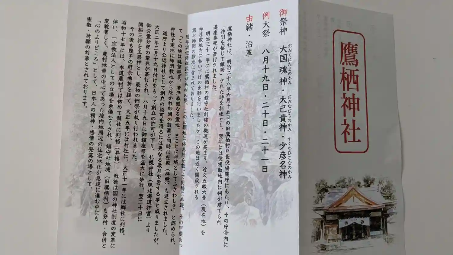 | ご由緒 | 鷹栖神社は、明治28年6月15日の旧鷹栖村戸長役場開庁にあたり、その庁舎内に「神名を招じて鎮座」された時を創祀とき、翌年には役場敷地内に祠が建てられ遷座奉仕されました。