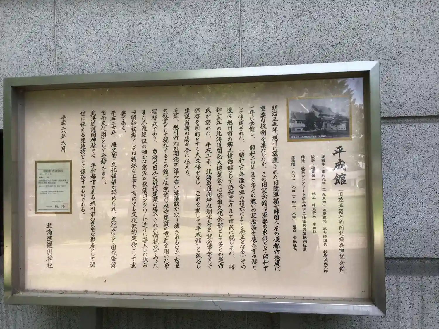 昭和6年満州事変以来支那事変はもとより、昭和16年12月8日大東亜戦争の勃発するや、北鎮の将兵は或は極北のアッツ島に或は灼熱の大陸の曠野に、或は南海の孤島に、或は洋上に、大空に勇躍征途に上って祖国防衛の任に当り、第二次世界大戦の最終戦争たる沖縄の玉砕に至るまで実に55,000柱の尊い身命を祖国に捧げられたが、英魂は永遠に故郷のこの御社に鎮まり給うた。