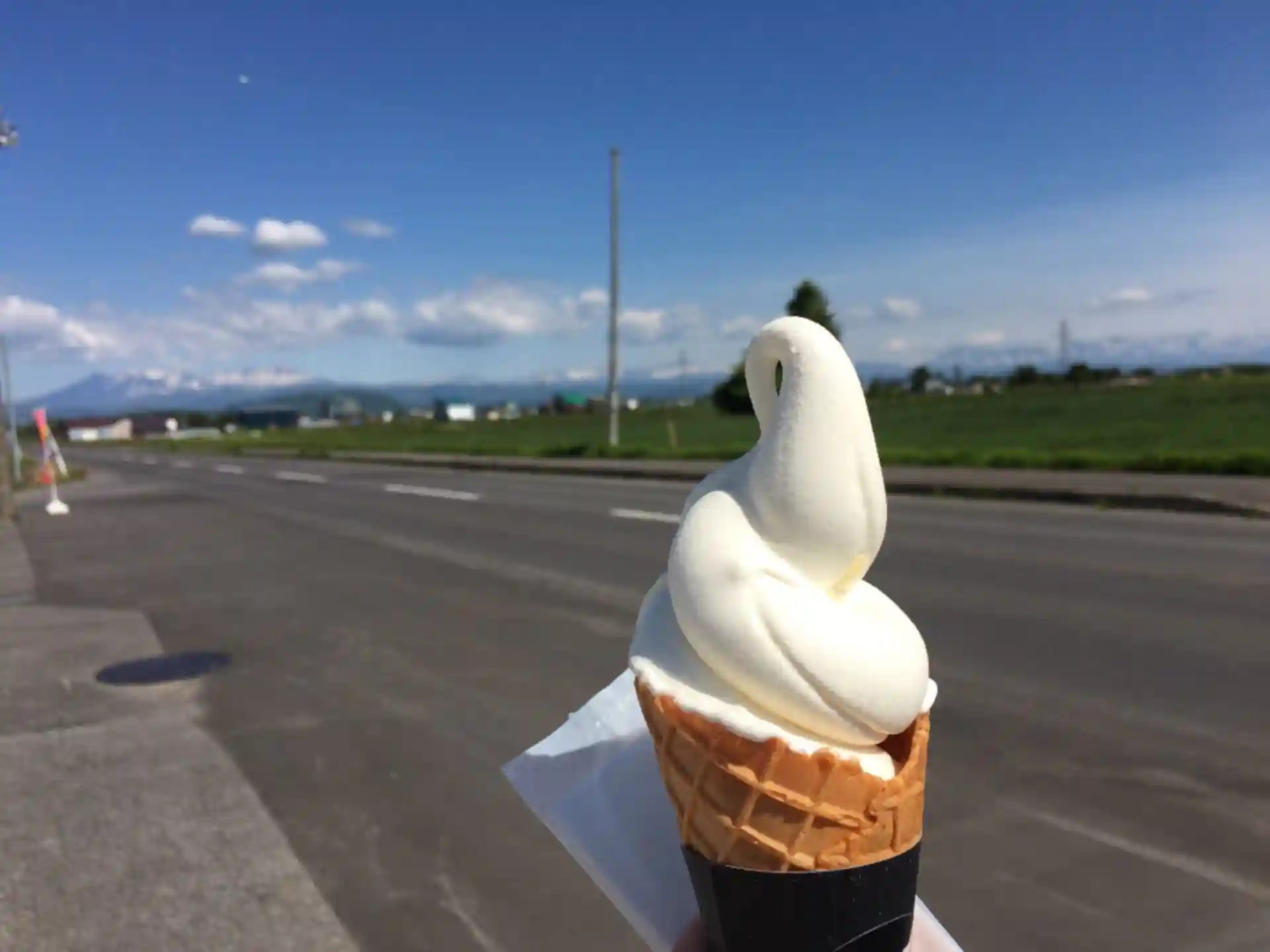 おまけ。この日は旭岳が素晴らしく綺麗に見え、神社に向かう道すがら、ちょうどいい所にソフトクリーム屋さんがあったので途中下車。少々お高めでしたが、景色を堪能できたのでよしとします(笑)