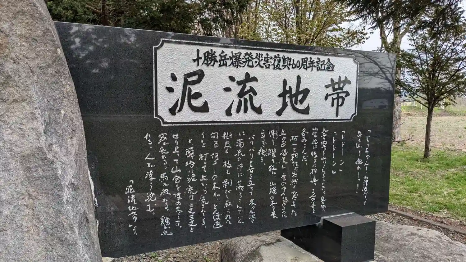 鳥居の反対側には十勝岳爆発災害復興60周年記念の泥流地帯碑がありました。