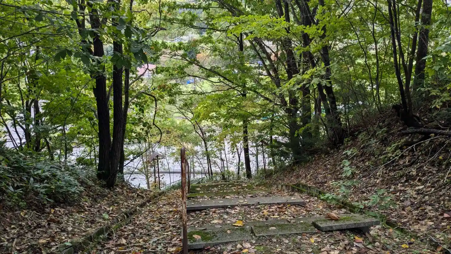 傾いている階段のコンクリート、かなり生えている草を避けて注意深く進むと…