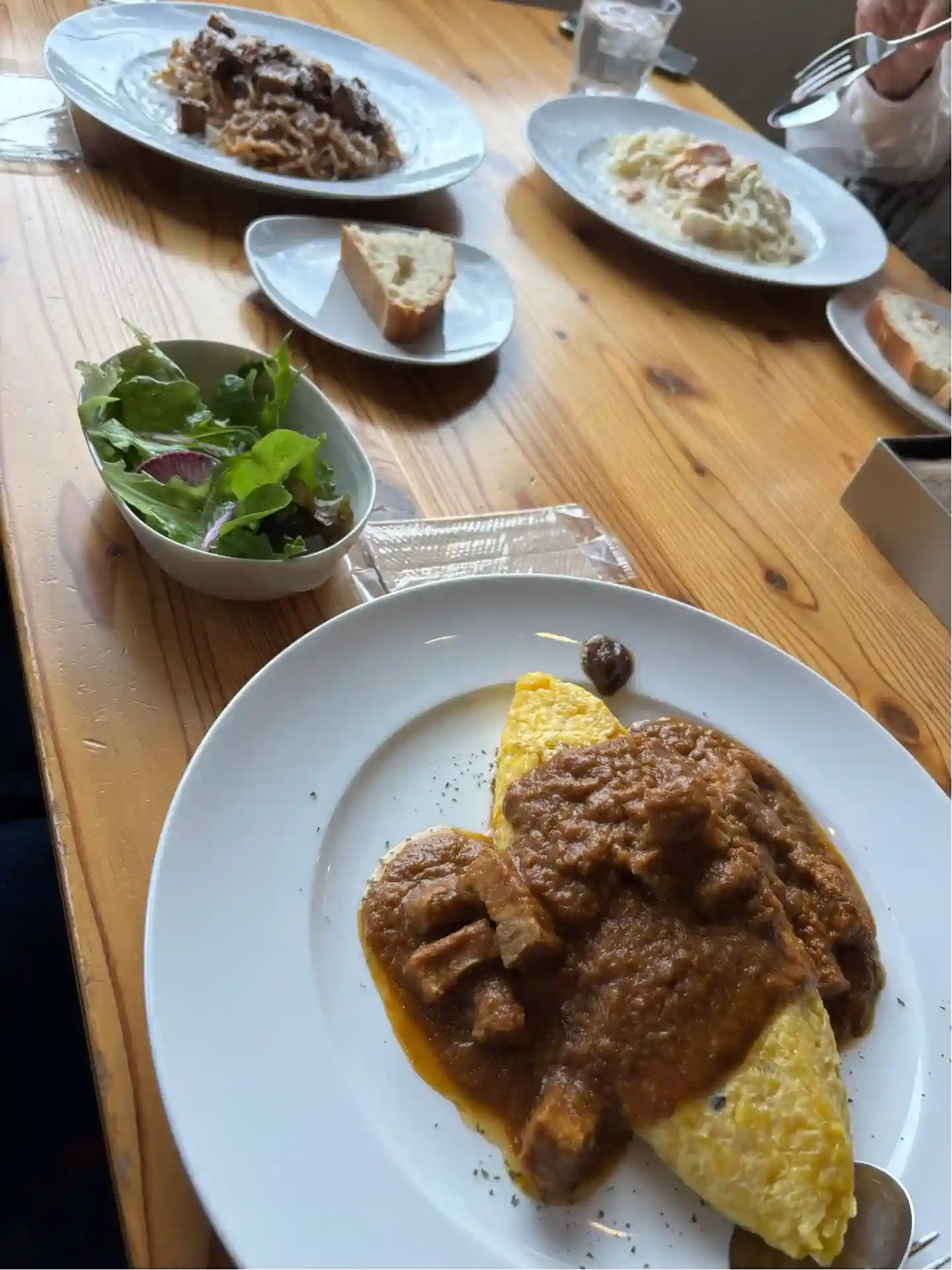 手前が私の「オムカレー」、左奥が娘の「ラグーソースパスタ」、右奥は妻の「ホタテとサーモンのクリームパスタ」。どれも大変美味しゅうございました。