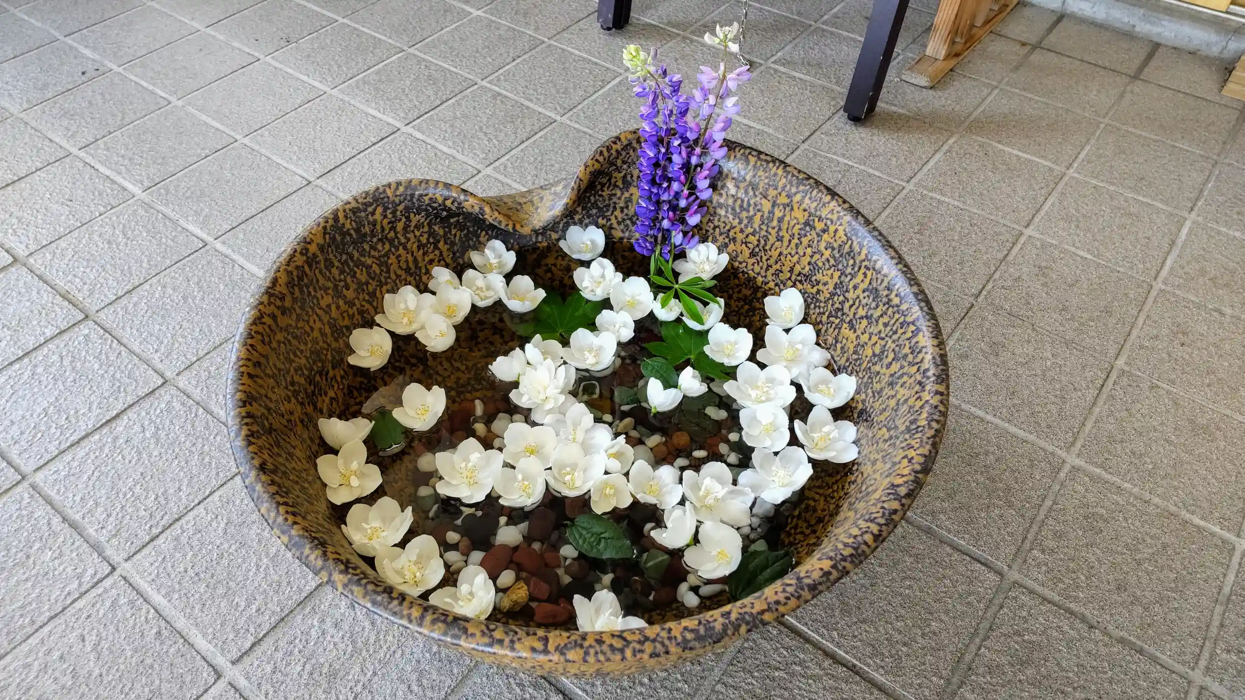 そのため社務所の風除室内に水鉢を置き、花手水を行うとのことです。