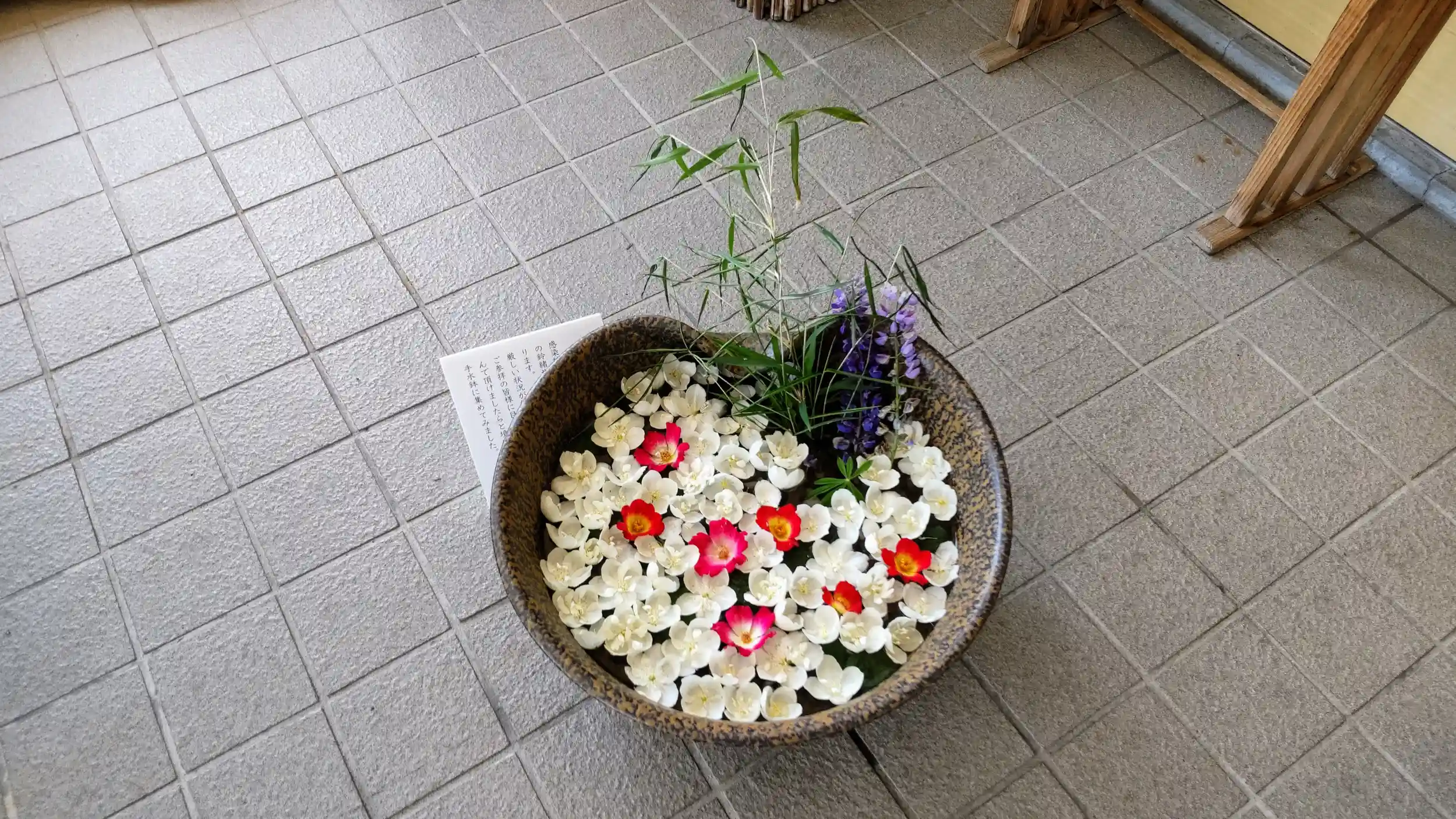 そして社務所の風除室内にはメインの花手水鉢が置かれています。