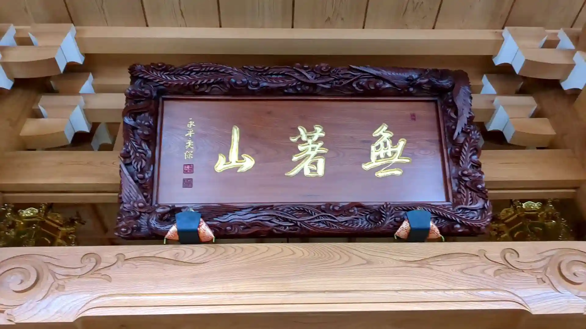 寺務所から入り御朱印帳に書いて頂いている間に本堂へ。かなり凝った装飾が施されていて広々としています。隅にいる便づる行者様は歯が出ていてどこか笑っているようにも見えます。