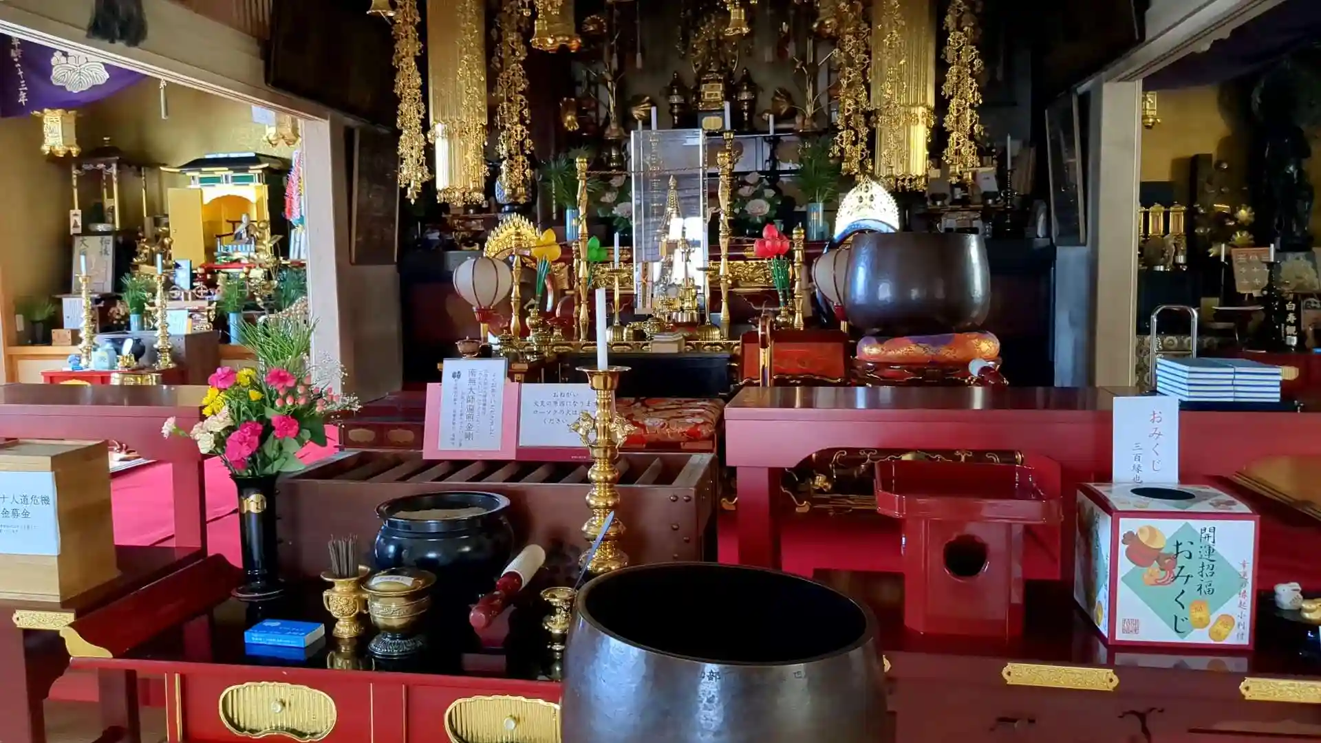 境内には薬寿観音や修行大師像などが祀られています。本堂の中は立派で御本尊の前にはおみくじや御守りなどが販売されています。撫でると身体の悪い箇所がよくなるという撫で五鈷杵などもあります。