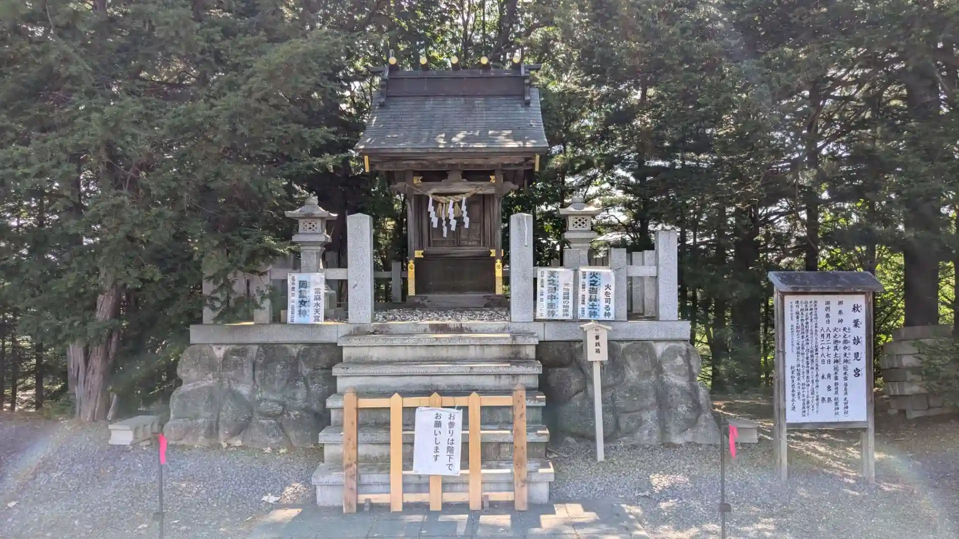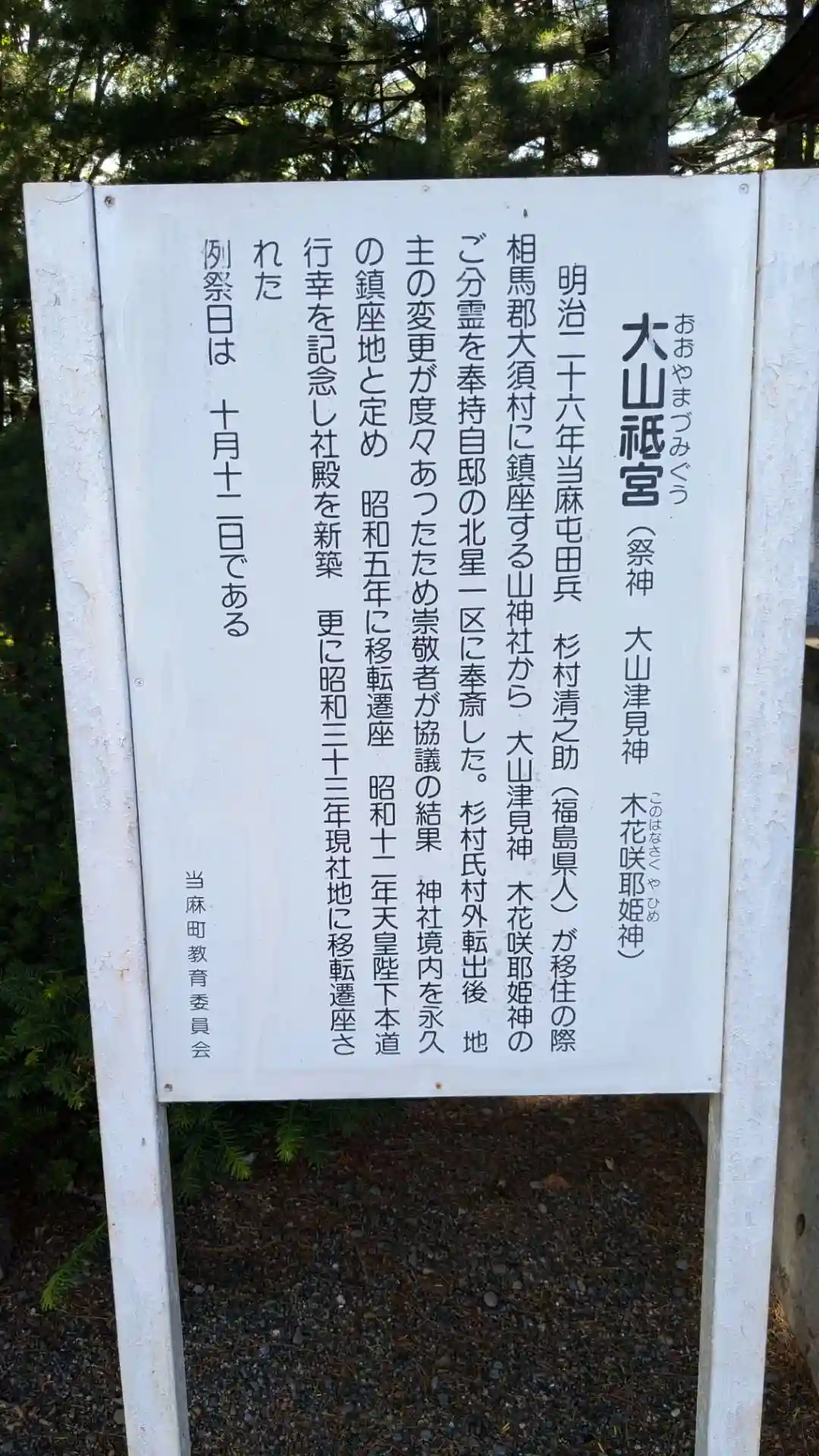 現在の當麻神社で特に目を引くのは社殿並みの高さを誇る忠魂碑。当麻町出身の戦没者の慰霊碑です。境内には他に末社の秋葉妙見宮と大山祇宮があります。