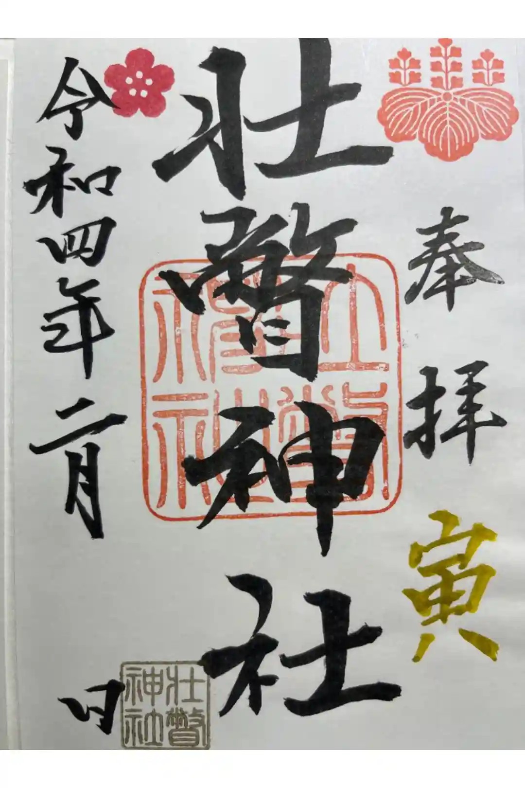 「御朱印をいただきたいのですが」と事前に電話でお願いしたところ、「この後出かけるので、書き置きを賽銭箱の右側に置いておきますよ!」と、親切に答えてくださいました😌。参拝後に御朱印代を賽銭箱に収め、缶の中から一枚頂きました。寅と角印の金色が美しいです。