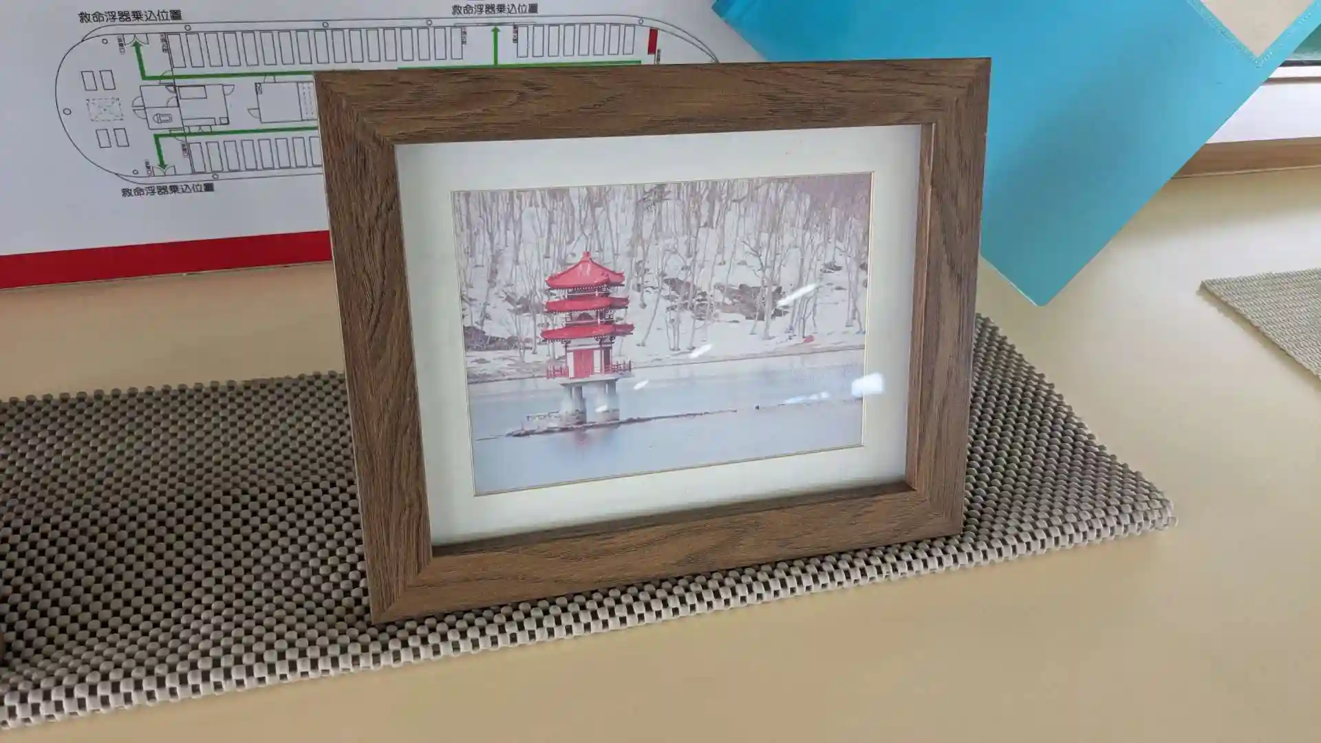 遊覧船に飾られていた冬の三重塔の写真