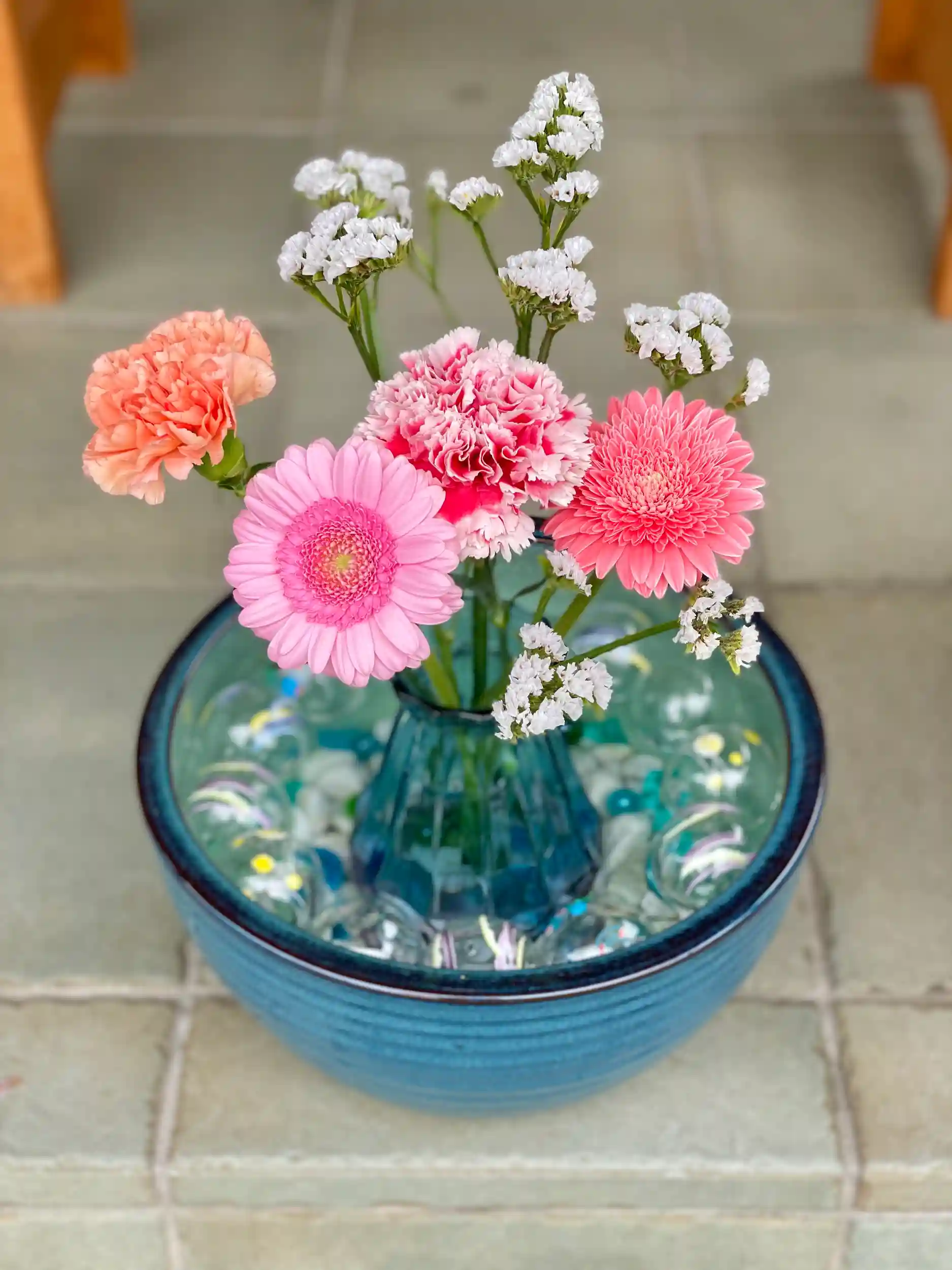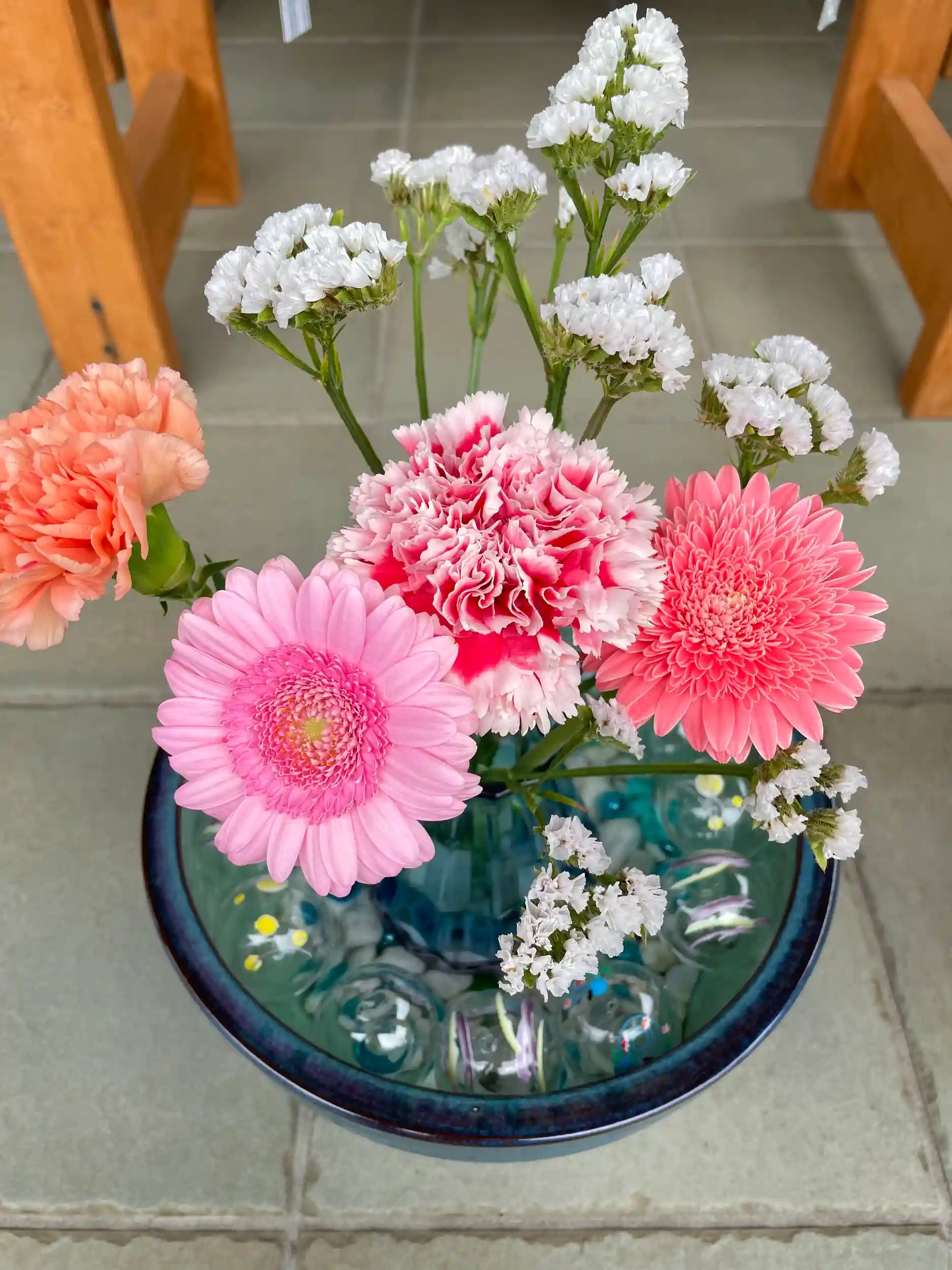 白色のスターチスに、色鮮やかなガーベラとカーネーションがよく映えます✨