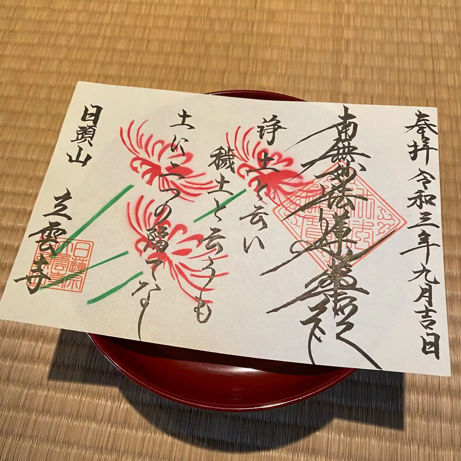 彼岸花のデザインです。文は日蓮聖人の御遺文「一生成仏抄」の一節です。