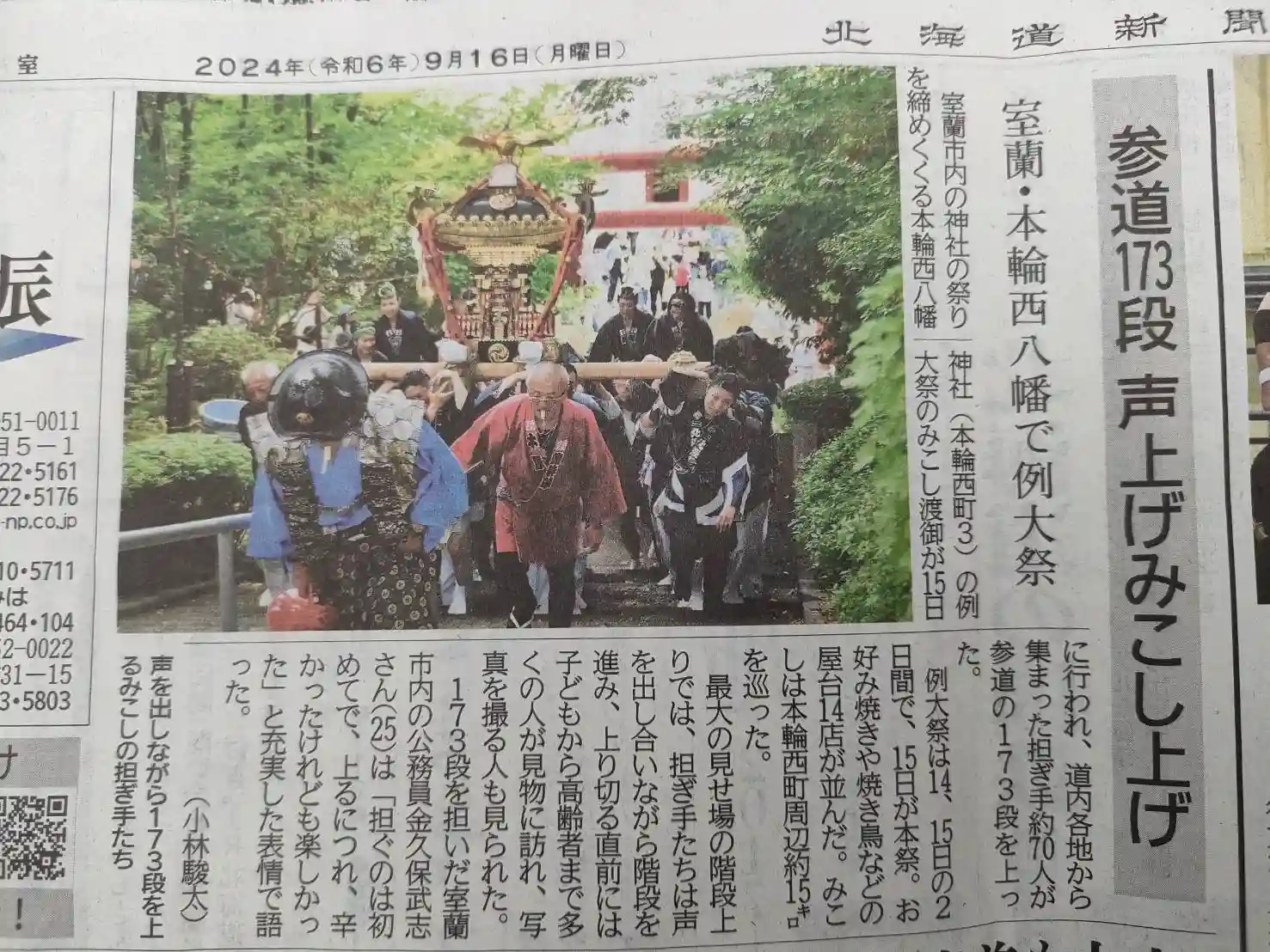 室蘭民報社様・北海道新聞社様より例大祭の御神輿渡御が掲載されました。ありがとうございます。