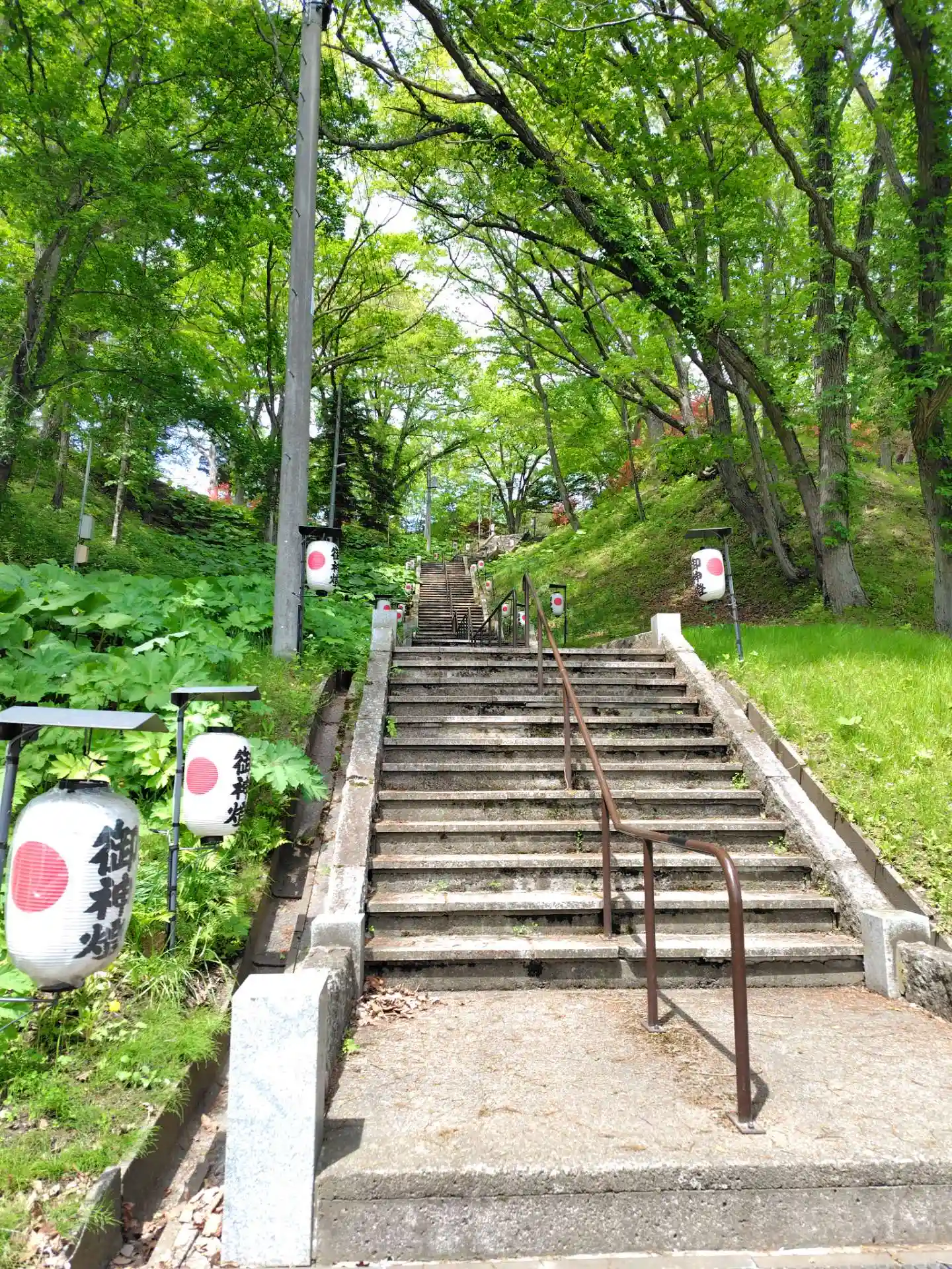 手水舎は二風谷コタンのチセと同じ茅葺屋根でこれも他の神社では見られないものなので感動しました。平取町は他にもサイレンススズカやダイタクヘリオスなどの競走馬を産んだ馬産地としても知られていて参道には牧場から奉納された提灯が並んでいました。