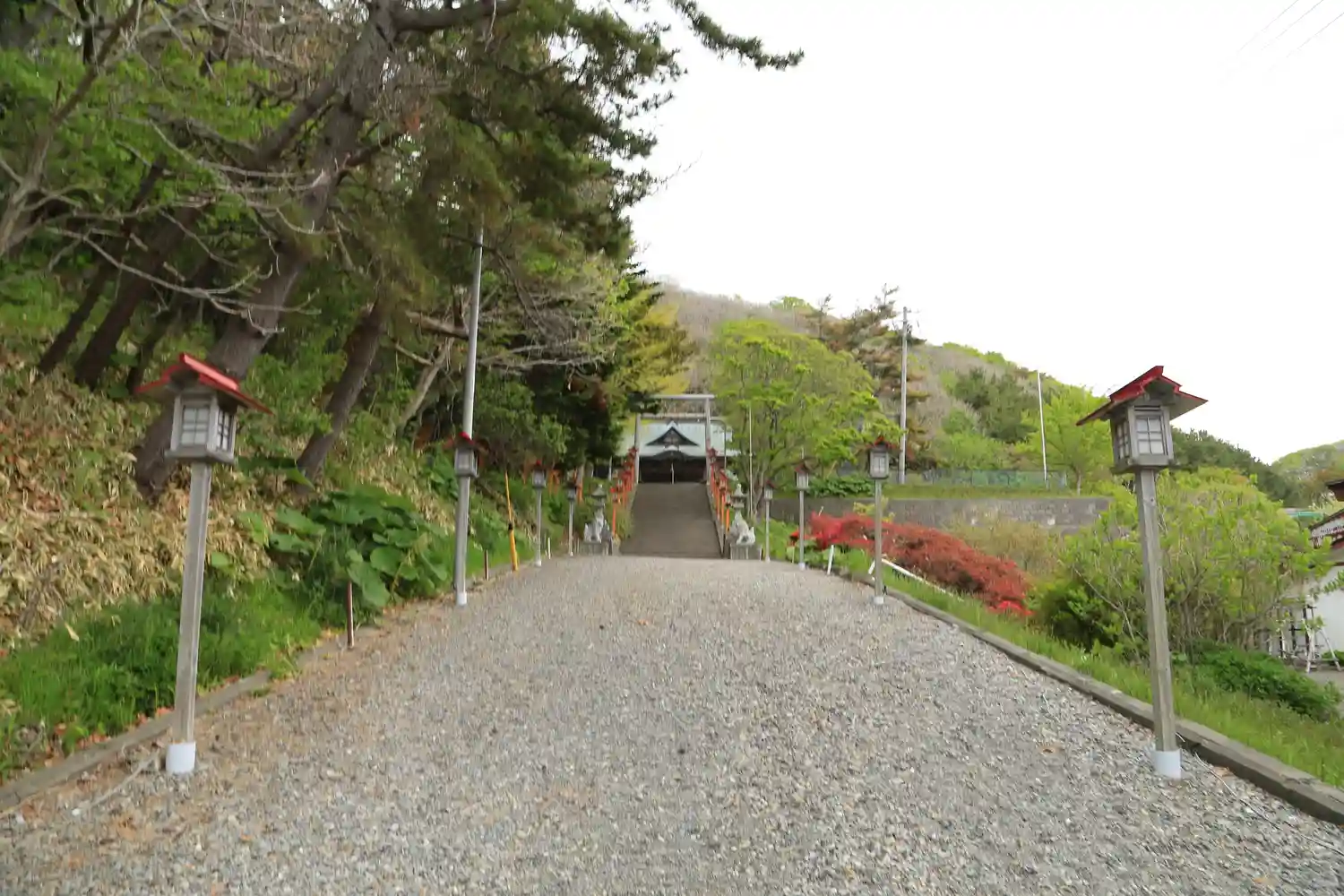 えりも町の市街地にある住吉神社は、一の鳥居から社殿まで、長い参道と石段が続いています。参道の両側に…