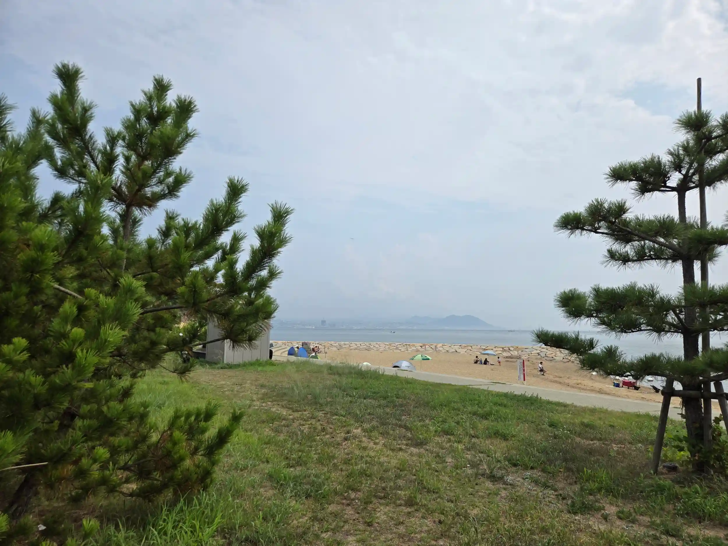 目の前の松の木の向こうは海水浴を楽しんでいる方がたくさん。