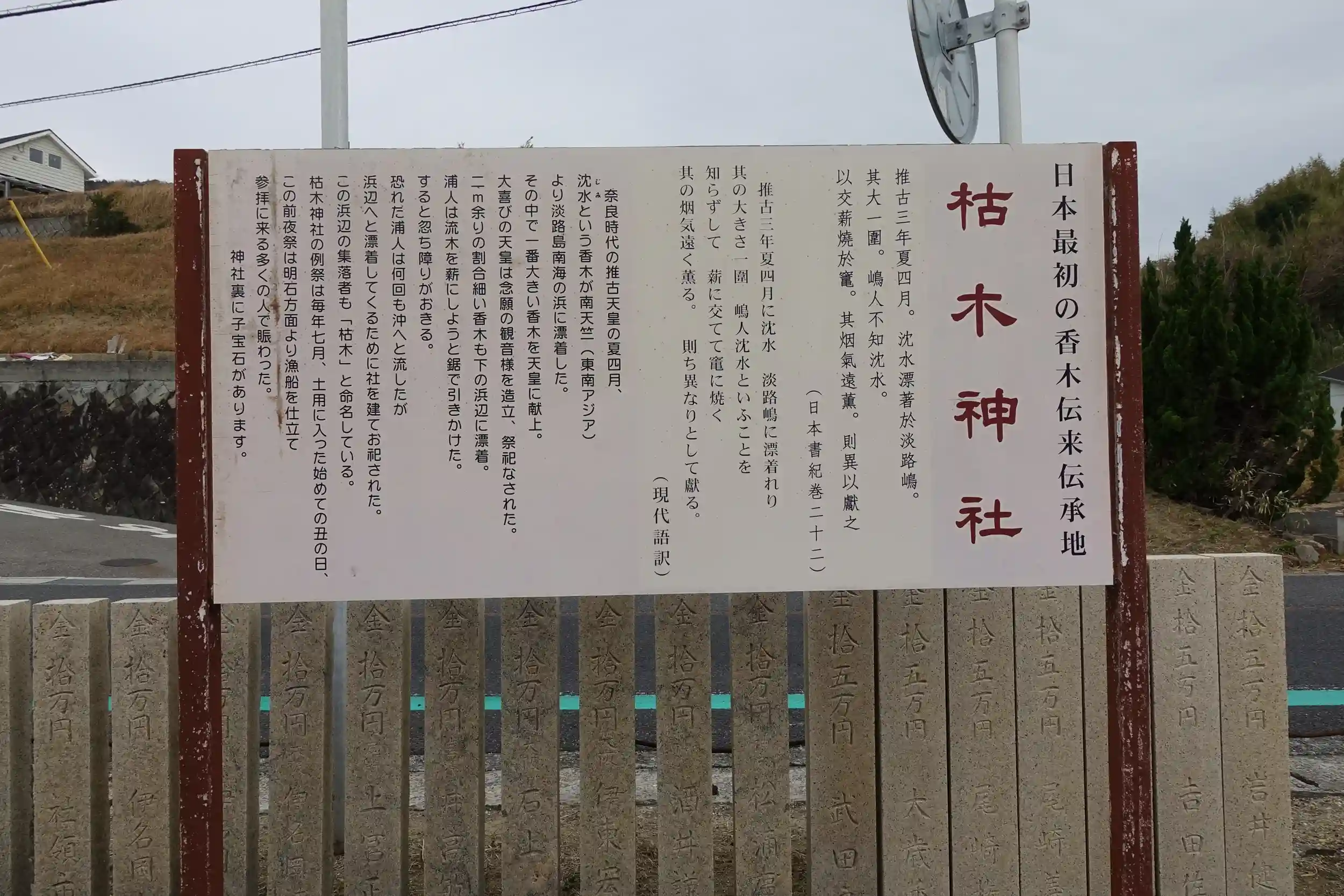 日本書紀には、推古天皇3年(595年)鎮座地周辺に流木が漂着。島民が薪として使うと気品の良い香りがした。その香木は推古天皇へ献上され、後に聖徳太子が観音像を作った。と記載があり、香木の記載としては最古です。