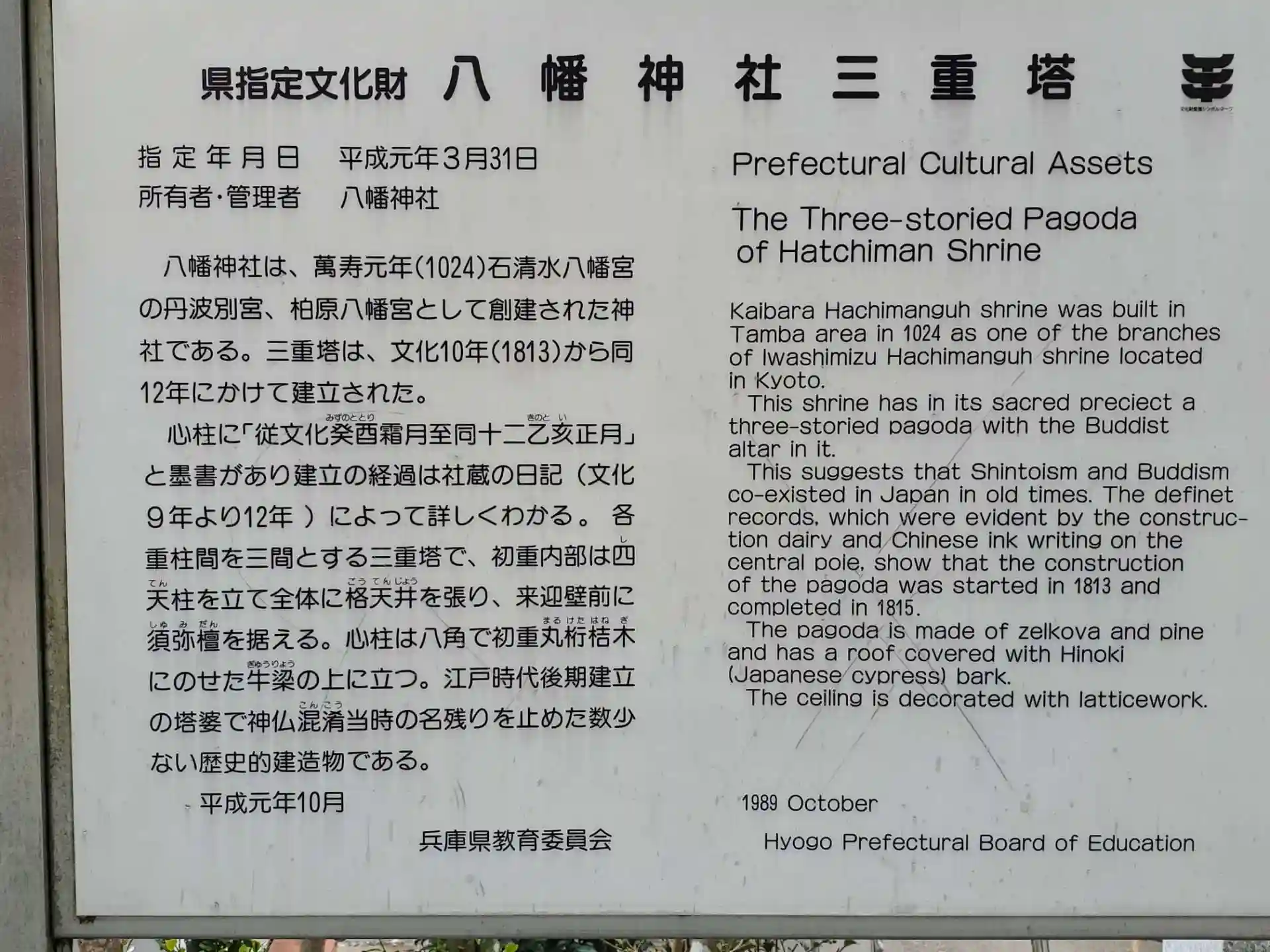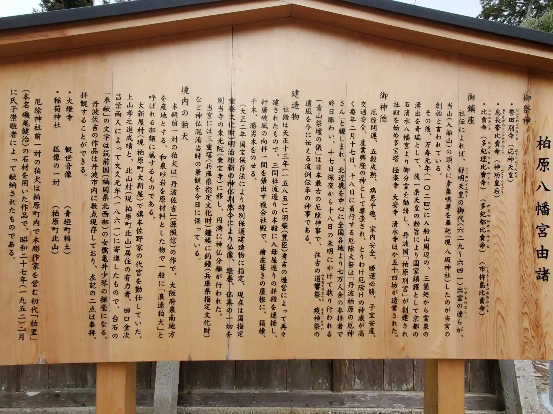 その後、萬寿元年(1024年)に入船山周辺の3箇所から霊泉の湧出を奇瑞とし、後一条天皇の勅意により国家鎮護の社として京都の石清水八幡宮より御分霊を勧請し、丹波国「柏原別宮」として創建されました。
