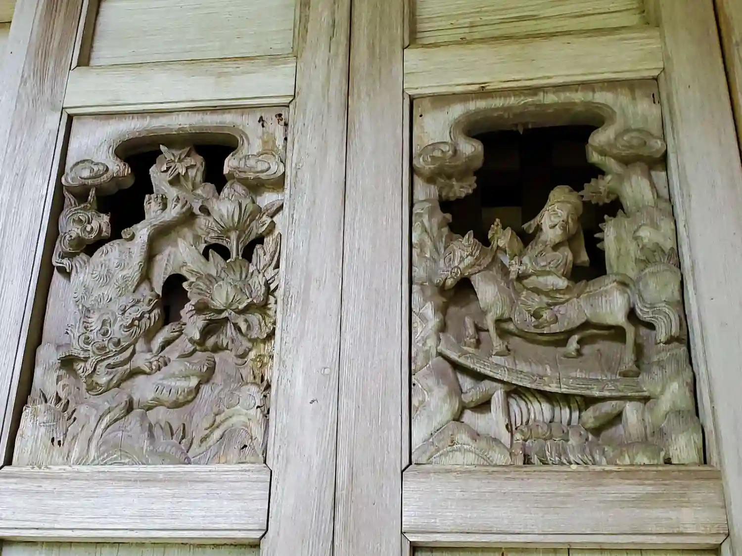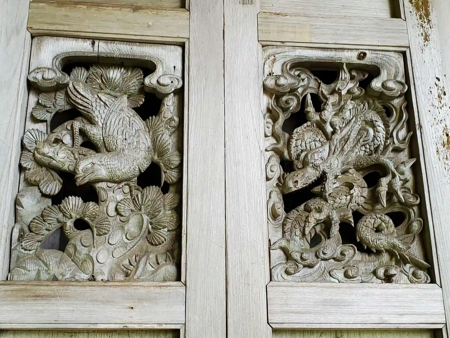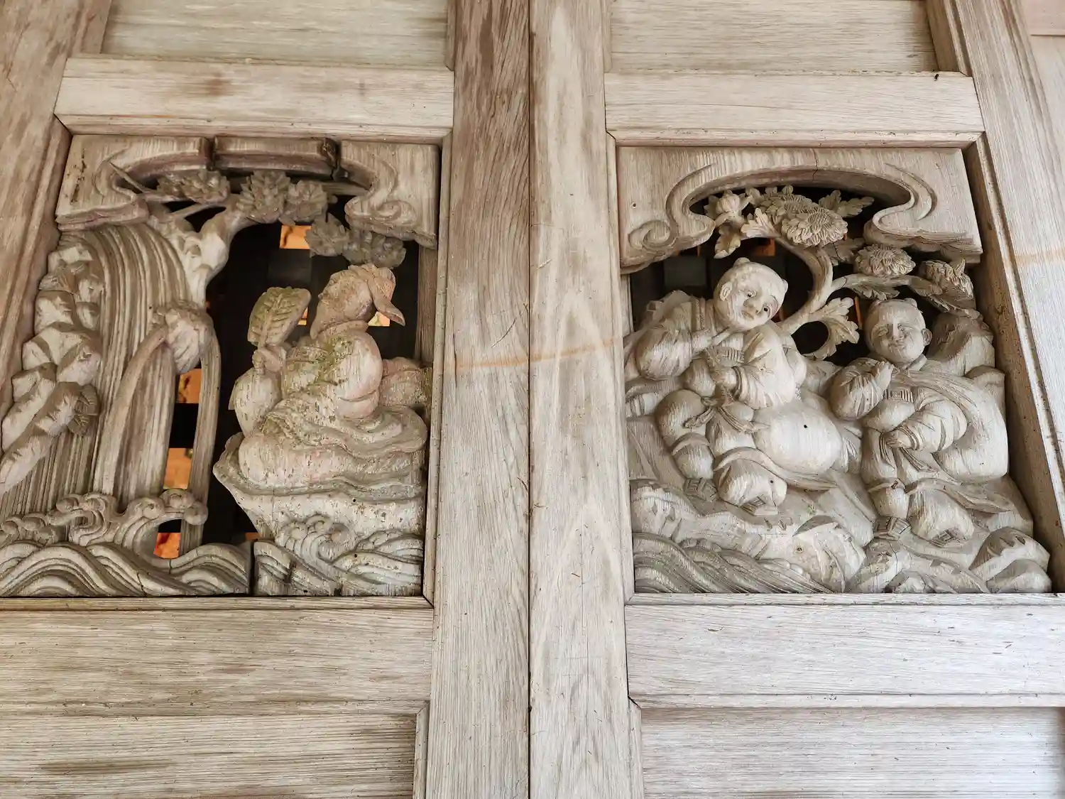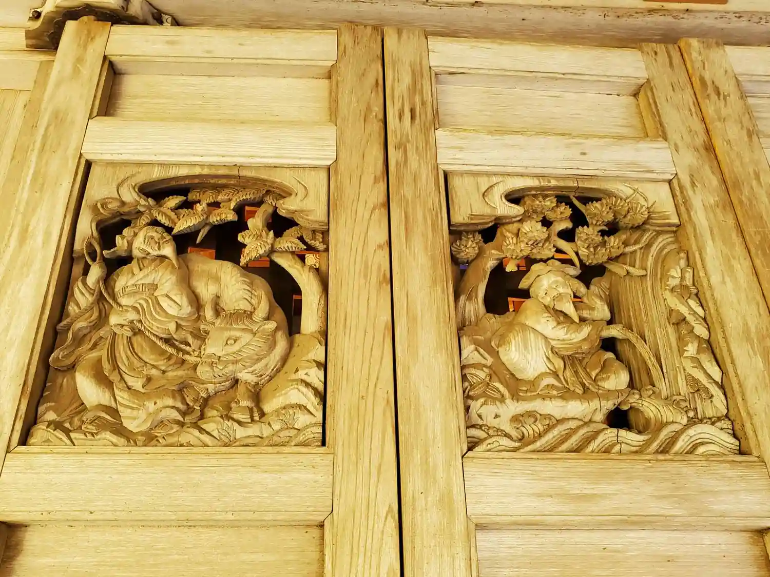 本堂の正面扉の彫刻(中央の右2枚)