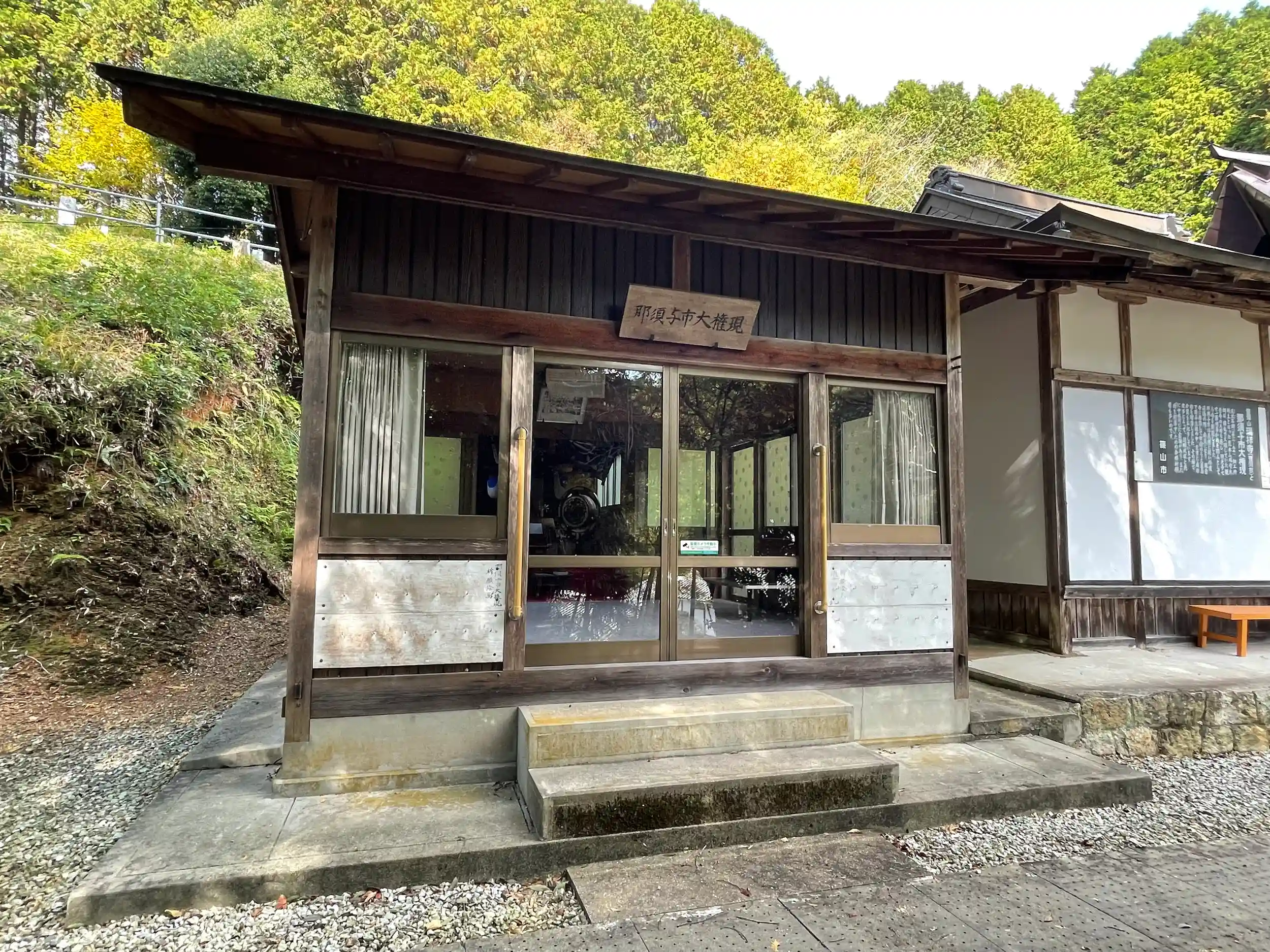 境内入ってすぐ右手に「那須与市大権現」と書かれたプレハブ御堂。扉は閉まっているが中は見たい放題。