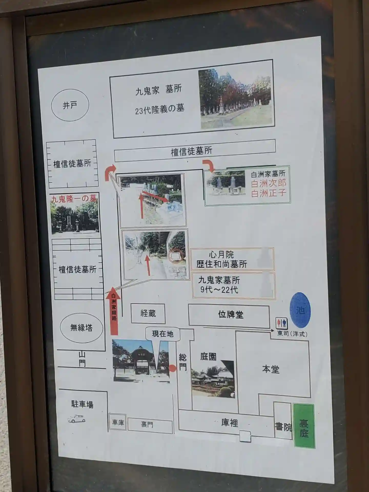 総門前には境内案内図があり、総門をくぐらずに左手に進むと、九鬼家や白洲家の墓所があることがわかります。