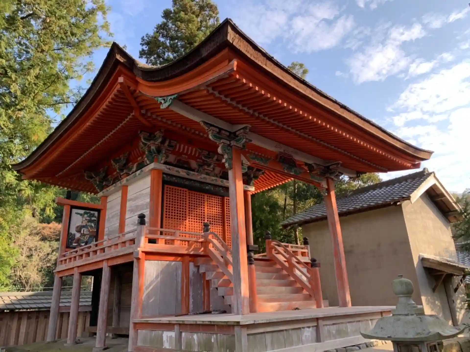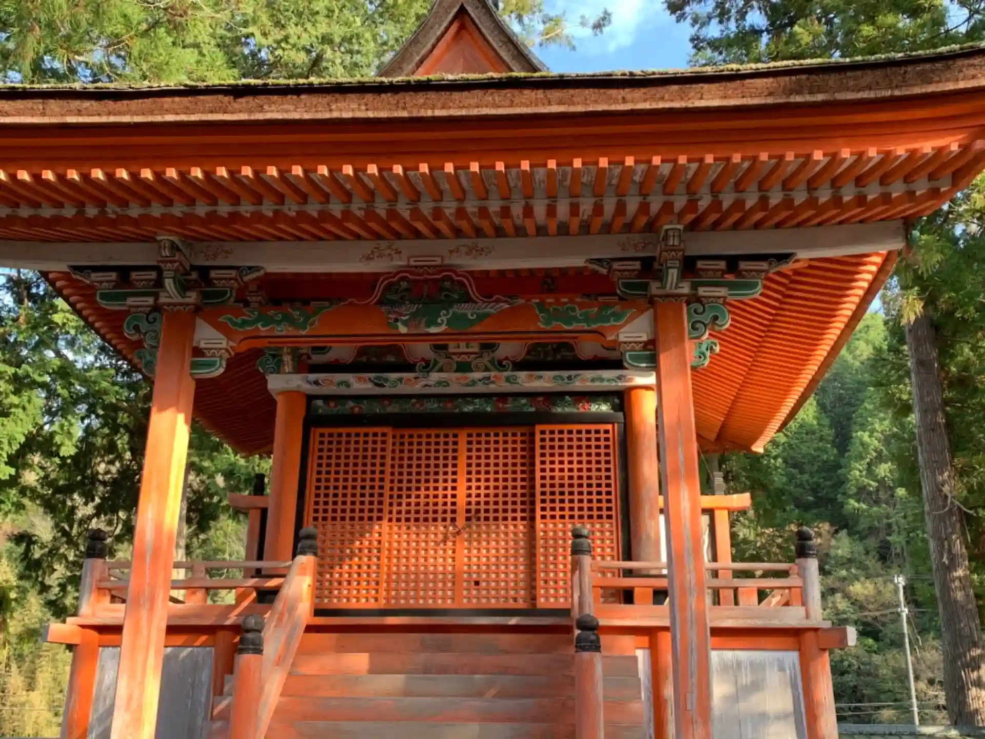 本殿が国の重要文化財に指定されています。檜皮葺の屋根に鮮やかな朱色の社殿です。